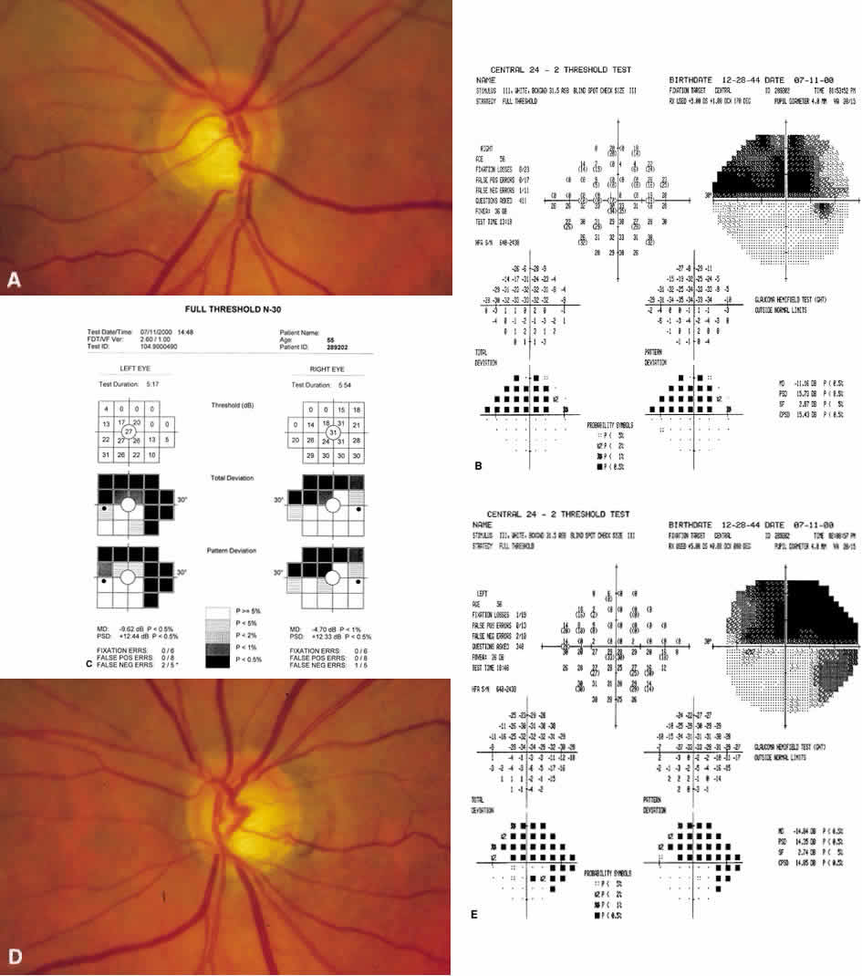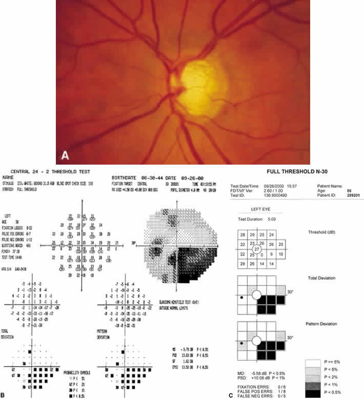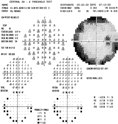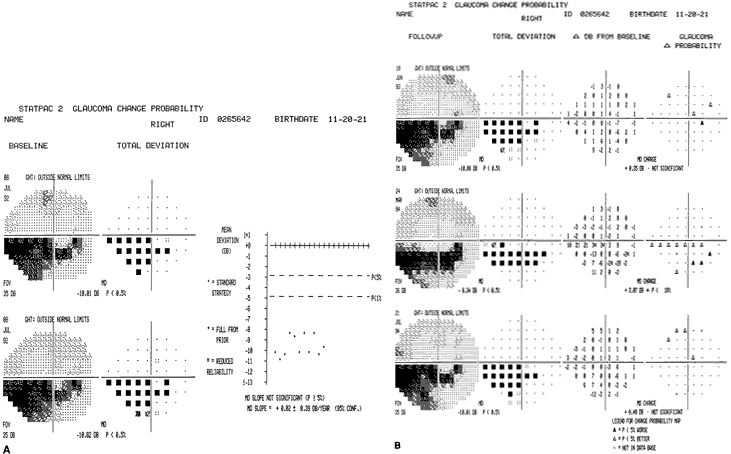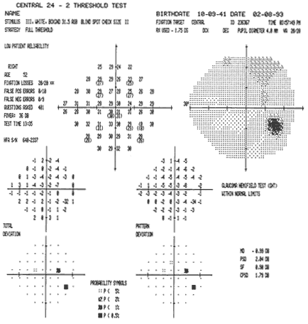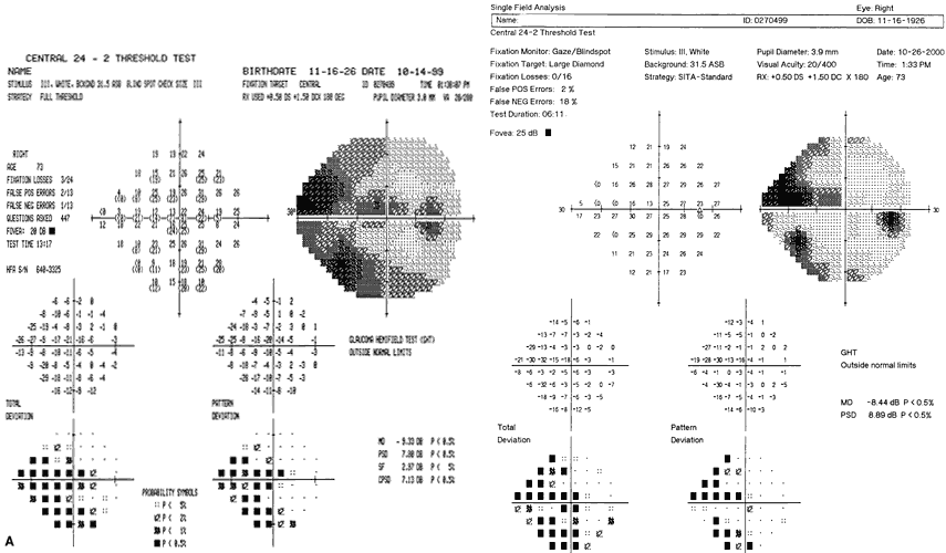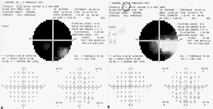 | Despite control of intraocular pressure, many eyes with glaucoma exhibit progression of visual field defects over time. Most eyes exhibit an increase in the density of the scotoma, and approximately 50% exhibit an increase in scotoma size or the appearance of a new scotoma.15 Progression of defects may occur in episodic bursts intermixed with stable periods of varying duration. If only one hemifield is involved, the defects remain localized to that hemifield for extended periods in 60% to 75% of eyes. Progression often occurs more rapidly when both hemifields are involved.12 The mean level of intra-ocular pressure does not differentiate glaucoma patients with progressive visual field loss from ones who remained stable.16 |
