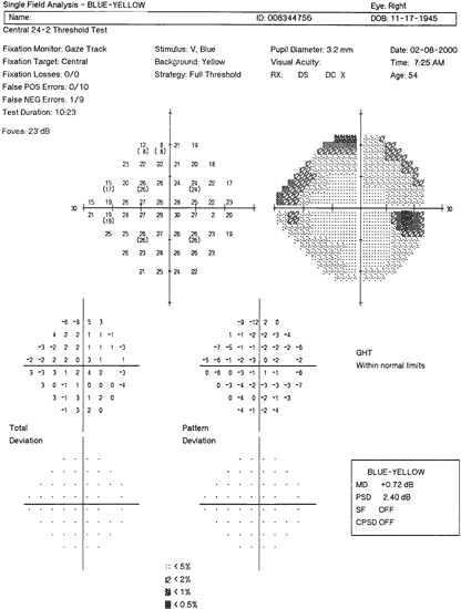 How can test time be minimized? The closer the initial stimulus is to the actual threshold, the faster the test will be completed. Humphrey perimeters use a “region growing” technique to determine the starting level for each point. After testing the fovea and blind-spot location, threshold is measured at one point in each quadrant. The threshold level measured at these four cardinal points determines the stimulus intensity used to start testing adjacent. On the Humphrey perimeter, if thresholds are more than 5 dB from expected values, the location is retested. The second result is printed below the first in parentheses. Fastpac The differential light threshold is determined at every point in the visual field; however, the 4-2 bracketing strategy is not used. Instead, threshold is measured using 3-dB steps, and the threshold is crossed one time only. Fastpac examination variability was found to be independent of defect depth when analyzed on the basis of pattern deviation probability values and to be independent of the area of visual field loss.19 Swedish Interactive Threshold Algorithm This new thresholding strategy is particularly useful because it decreases test time by about half. In a given time period, Swedish Interactive Threshold Algorithm (SITA)-Standard and SITA-Fast collect twice as much information as the Humphrey Full Threshold and the FastPac respectively. Testing of each location is started at a level that is near threshold, which shortens the time spent searching for the threshold.20 The time interval between responses is customized to each patient's reaction time. SITA calculates false-positive and false-negative catch trials from the threshold measurements, eliminating the need for separate testing of the false catch trials; this accounts for 6% of the decrease in test time in comparison to the full threshold strategy. SITA uses artificial intelligence and computer modeling, incorporating probability models of normal and glaucomatous visual fields to provide more efficient testing of the visual field. Testing is interactive, using each response from a patient to help predict future responses. Information incorporated in the interactive testing includes comparison to reference fields in normal and glaucomatous eyes, normal age-corrected threshold values, patterns of glaucomatous damage, and multiple frequency of seeing curves in normal and abnormal states. At the end of the test, the threshold is recalculated based on all the available data. The time interval for each response is analyzed and those responses that were likely false are discarded. The program estimates the threshold expected at each point on a continuous basis and stops testing when the estimated error is less than a predetermined value. The confidence limit is narrower for SITA standard than SITA fast, which is why SITA standard takes longer. The lower error in the SITA standard test decreases the variability of the examination and makes SITA standard more reliable than SITA fast for future comparisons.21 It is thought that SITA-Standard is at least comparable in repeatability to full threshold strategies. However, threshold values from full threshold and SITA standard tests are not directly comparable; defects appear shallower with SITA, which may in part reflect diminished patient fatigue. Software is currently under development to aid in the comparison of multiple tests from the two strategies (Fig 21). Short-Wavelength Automated Perimetry Short-wavelength automated perimetry (SWAP) is a static threshold perimetry test in which a blue stimulus (440 nm) is presented on a background of yellow illumination.20 The yellow background desensitizes the green and red cones, whereas the blue stimulus activates the blue cones. Overall, the blue cones and their ganglion cell connections are tested. SWAP detected glaucomatous field defects at a significantly earlier time than white-on-white perimetry and revealed a faster rate of progression.22 One concern is that the variability between testing sessions is greater using SWAP.23 It is unclear whether the success of SWAP in detecting early defects relates to identifying preferential damage to the blue/yellow cone system, or whether the testing of only a subset of the visual system enables earlier detection even if the damage is not selective. SWAP testing takes 15% longer than full threshold testing. The blue cone system is slower and patients report that the test seems different. Even experienced field takers may not do well on their first SWAP test and may exhibit a learning effect between the first and second tests. The test is greatly affected by cataract. A size V stimulus is required (Fig. 22).