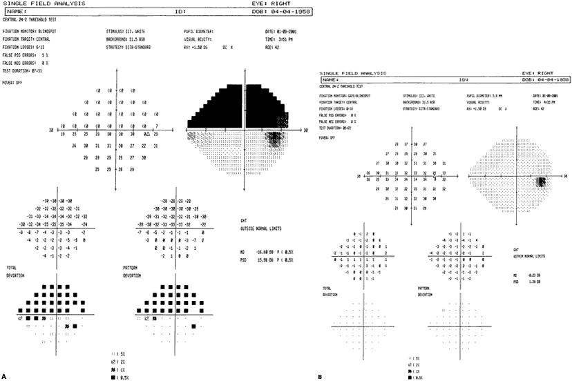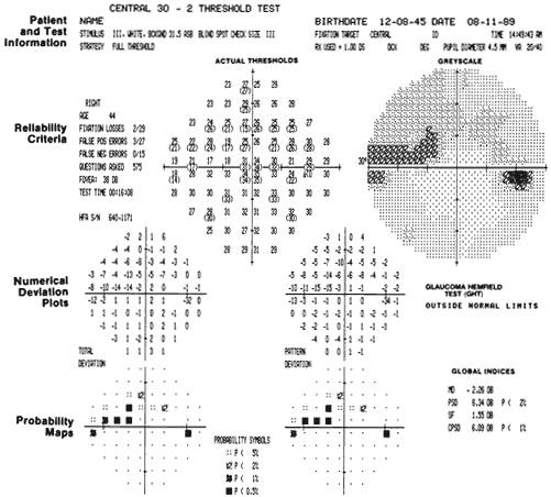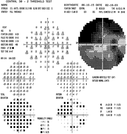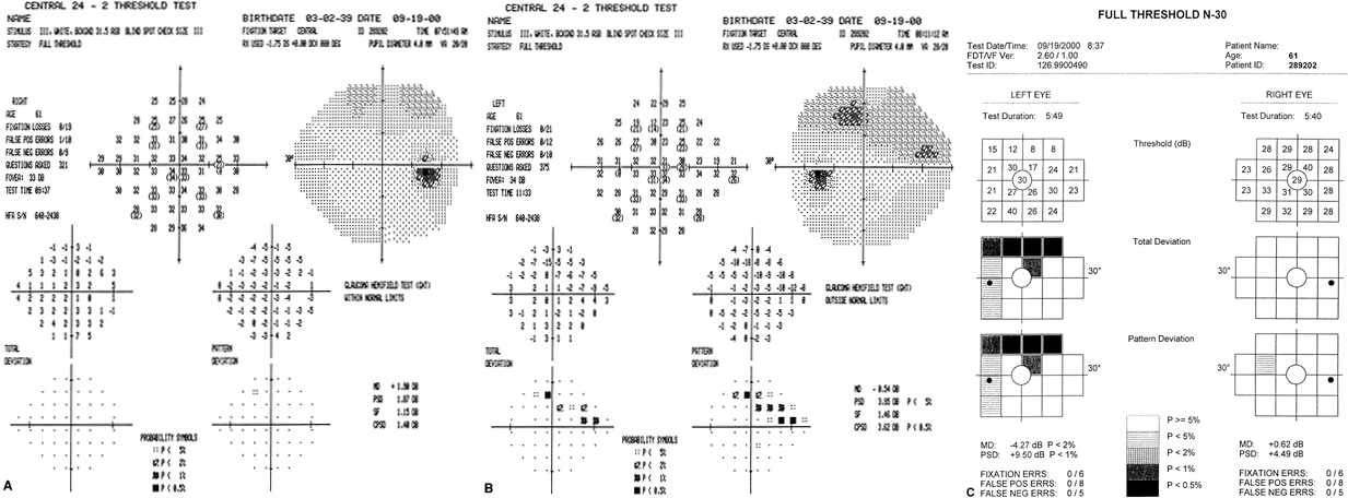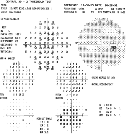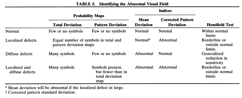 NUMERIC PRINTOUTS Even if a sophisticated data analysis program is used, one should always inspect the numeric printout. Gray scales provide only a semiquantitative assessment of the visual field, with interpolated values printed between tested points, and they are insufficient for full analysis. Most programs present numeric data in two forms: the actual thresholds plot and the difference plot. The actual thresholds plot shows the differential light sensitivity at each location measured. The numbers in the difference plot represent the difference between the measured threshold and the age-corrected normal value for each point in the visual field. Statistically, a few isolated points that deviate more than 4 dB from values for age-matched controls can occur in a normal visual field without necessarily indicating an abnormality. A defect is more likely to represent an abnormality when a large number of contiguous points are involved, the depression is dense, and the defect is reproducible on subsequent perimetry. Defects are more likely to represent a glaucomatous abnormality if they fit into a known nerve fiber bundle pattern. Points at the edge of the test area (rim points) may be abnormal in otherwise normal visual fields and may not indicate glaucomatous damage. Testing of the peripheral visual field may allow one to differentiate a peripheral artifact from a true visual field defect. The difference plot detects deviations from age-matched controls, but they occasionally may miss early subtle defects, particularly if the baseline retinal sensitivities for a patient are greater than average. Therefore, raw threshold plots should be scrutinized for shallow defects by looking for small clusters of points that are surrounded by points of higher thresholds. Particular attention should be given to the paracentral and nasal step regions. PROBABILITY PLOTS Humphrey Statpac software provides two types of numeric difference plots: the total deviation plot and the pattern deviation plot, each with a corresponding probability map (Fig. 34). The pattern deviation plot highlights localized defects by correcting for diffuse changes in the hill of vision. The probability plots for both the total and pattern deviation maps indicate the statistical significance of the deviation for each point tested. The darker the symbol, the less likely it is that a point depressed by that amount would occur in a normal population.41,42 If the probability symbols in the total and pattern deviation maps are similar, the defect is predominantly localized (Fig. 35). If there are many probability symbols in the total deviation map but few in the pattern map, the defect is mainly diffuse (see Fig. 17). If both maps have probability symbols but many more symbols are found in the total deviation map, there is mixed localized and diffuse damage (Fig. 36). GLOBAL INDICES An enormous amount of information is generated by automated perimetry. Calculation of the global indices is a form of computer-assisted data reduction. Global indices depict the overall characteristics of the visual field that are clinically important43,44 Mean deviation reflects the overall depression or elevation of the visual field. The deviation from the age-matched normal value is calculated at each location in the visual field. Mean deviation is the weighted average of the deviation values for the locations tested. Although influenced by any type of visual field defect, it is most sensitive to diffuse changes in the visual field and is relatively insensitive to smaller localized defects. Short-term fluctuation has already been described. It measures the intratest variability. Irregularities of the smooth contour of the hill of vision are reflected by an elevated pattern standard deviation. Such irregularities can be due to a localized visual field defect or to patient variability. The corrected pattern of standard deviation provides a measure of the irregularity of the contour of the hill of vision that is not accounted for by patient variability (short-term fluctuation). It is increased when localized defects are present (see Fig. 35). The Humphrey program provides probability values for results that lie outside the normal limits. The Octopus program provides analogous indices in some of its printouts. Mean defect, loss variance, and corrected loss variance are equivalent to mean deviation, pattern standard deviation, and corrected pattern standard deviation, respectively, on the HFA. Octopus calculates the mean sensitivity that is the average of the threshold values for all test locations. Age-corrected normative data are not used in calculating the mean sensitivity. HEMIFIELD ANALYSIS Localized glaucomatous loss typically occurs asymmetrically and often involves only one hemifield. Therefore, comparing the differential light sensitivity of corresponding regions of the two hemifields may highlight an early abnormality of the visual field.45 One available hemifield comparison test is Humphrey Statpac 2 software. The Statpac 2 hemifield test compares the probability values from the pattern deviation map at five regions in each hemifield. Fields are classified as normal, borderline, or outside normal limits. The Statpac 2 hemifield test also indicates when significant generalized reduction of sensitivity or abnormally high sensitivity is present.46 INTEREYE COMPARISONS The difference in the mean sensitivity between a patient's two eyes is less than 1 dB 95% of the time and less than 1.4 dB 99% of the time. Intereye differences greater than these values are suspicious if they are unexplained by nonglaucomatous factors, such as unilateral cataract or miosis.47 ASSESSING PROGRESSION OF VISUAL FIELD DEFECTS It can be difficult to determine whether a new visual field examination shows progressive glaucomatous damage. The large amount of data generated by automated perimetry and the confusion caused by the large fluctuations of threshold response complicate in