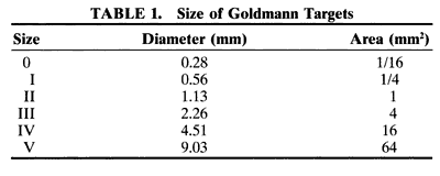 MANUAL PERIMETRY: THE GOLDMANN VISUAL FIELD The Goldmann perimeter is the most widely used instrument for manual perimetry. It is a calibrated bowl projection instrument with a background intensity of 31.5 apostilbs (asb), which is well within the photopic range. The size and intensity of targets may be varied to plot different isopters kinetically and determine local static thresholds.4 The stimuli used to plot an isopter are identified by a roman numeral, a number, and a letter. The roman numeral represents the size of the object, from Goldmann size 0 (1/16 mm2) to Goldmann size V (64 mm2) (Table 1). Each size increment equals a twofold increase in diameter and a fourfold increase in area.