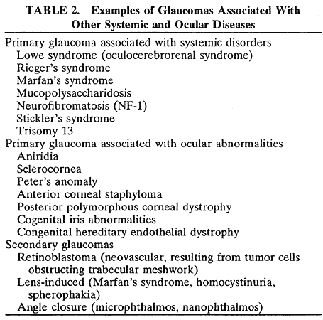 | Glaucoma can be associated with various other genetic and congenital disorders (Table 2). The mechanism may be primary or secondary. A thorough discussion of