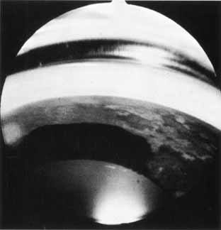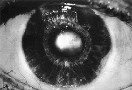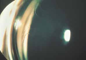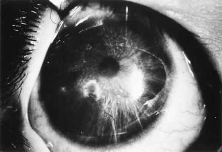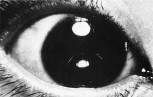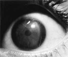 Midperipheral corneal lesions involve broad areas of iris adhesion. The cornea is frequently opacified in these areas of attachment. Pupillary anomalies and iris holes are often associated. These lesions are generally found in Rieger's anomaly. Central corneal defects are usually opacified and thinned, with a zone of clear cornea between the defect and limbus. Strands of iris tissue from the collarette may attach to the leukoma. In some cases there may be lens apposition to the corneal defect. These findings are typically seen in Peters' anomaly (Fig. 8).