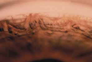 is stretched so that the stroma appears thinned. The scleral ring, through