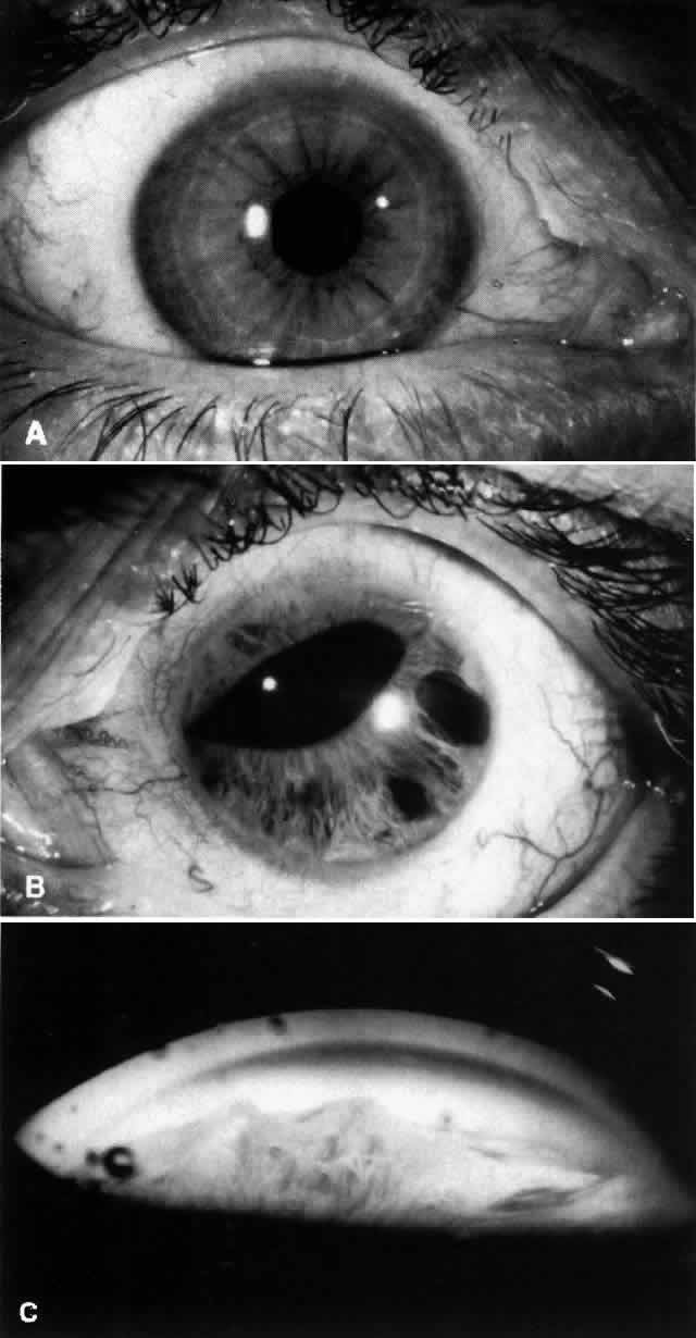 In the majority of patients, only limited regions of Descemet's and the endothelium are involved.21,22 These patients are usually asymptomatic and may be unaware of their condition. Even areas of cornea that appear normal on biomicroscopy may have specular microscopic abnormalities, including abnormally small endothelial cells or enlarged pleomorphic endothelial cells.23 In cases with large areas of endothelial involvement, there may be focal or diffuse overlying corneal edema that can be severe enough to require penetrating keratoplasty. The edema can be so advanced as to preclude slit lamp evaluation of the posterior cornea, in which case the diagnosis can sometimes be made by recognizing typical lesions in family members. Corneal edema has been noted more commonly in older patients, presumably due to progressive corneal changes, but can be present in childhood or even at birth.21,22 Histopathologically, the most unusual finding in PPMD is that some areas of damaged endothelial cells have epithelial-like characteristics. These cells contain extensive microvilli and keratofibrils and have desmosomal attachments.22,24 The epithelial character of these cells has been confirmed by the demonstration that they contain epithelial keratins.25 In other areas, endothelial cells are degenerated, attenuated, and vacuolated. Fibroblastic proliferation has also been noted.22,26 Abnormalities in Descemet's membrane include abnormal lamination, deposition of abnormal fibrillar collagenous material on the posterior surface with areas of irregular guttate excrescences,22,26 and pits.26,27 These changes are probably secondary to the endothelial abnormalities.22,26 The abnormal endothelial cells, both those with and without epithelial characteristics, have been found to extend across the trabecular meshwork and onto the surface of the iris.22,24 It is likely that this extension results in the iridocorneal adhesions that occur in some patients with PPMD. These adhesions vary from peripheral anterior synechiae visible only on gonioscopy to prominent adhesions easily visible by slit lamp examination. In some cases, translucent membranes apparently extending from the posterior cornea are visible on the surface of the iris; these cause ectropion uveae and corectopia in occasional patients.22,28 The incidence of glaucoma in PPMD appears to be less than in the ICE syndrome. Krachmer reported that 14% of the referred patients he had examined with PPMD had elevated intraocular pressure.22 Since so many patients with PPMD are asymptomatic, the true incidence of elevated intraocular pressure is probably much lower. Most of the patients in Krachmer's group with elevated intraocular pressure had iridocorneal adhesions that closed portions of the filtration angle. A second group of PPMD patients with open angles and without iridocorneal adhesions have been recognized.21,22 The cause of the pressure increase in these patients is uncertain; in one such case examined histopathologically, an abnormally high insertion of the iris into the posterior trabecular meshwork with some collapse of the intertrabecular spaces was noted.29 Management When present, glaucoma is best initially managed with medications that decrease aqueous secretion. Miotics may be helpful if areas of open angle are present. There are the same concerns with the use of laser trabeculoplasty in this condition as in the ICE syndrome: because of the growth of a cellular membrane across the chamber angle, trabeculoplasty might accelerate synechiae formation and thus aggravate rather than help the situation. In those patients whose intraocular pressure cannot be controlled medically, filtering surgery is probably the safest option. Penetrating keratoplasty is required in only a minority of patients with PPMD. In those patients without iridocorneal adhesions or glaucoma, the prognosis for maintaining a clear graft is excellent. Patients with iridocorneal adhesions have a much lower success rate: only 31% with adhesions achieved 20/40 (6/12)* or better acuity compared with 78% without adhesions achieving this vision in Krachmer's series.22 Preoperative glaucoma, even though controlled at the time of surgery, was also found to be a poor prognostic factor for keratoplasty: 69% of eyes with glaucoma had final visual acuities of 20/400 (6/120) or less. In comparison, all eyes with normal intraocular pressure had better than 20/400 visual acuity after transplantation.22 All patients with preoperative glaucoma continued to have difficulties with glaucoma postoperatively.22 There was an overlap between these two groups since all eyes with glaucoma also had iridocorneal adhesions. Thus the presence of iridocorneal adhesions and preoperative glaucoma are poor prognostic factors for successful keratoplasty in PPMD and are more important to the outcome than is the severity of the corneal disease itself.22 * Metric equivalent given in parentheses following Snellen notation FUCHS' ENDOTHELIAL DYSTROPHY The terms Fuchs' endothelial dystrophy is applied to patients with extensive corneal guttata (often accompanied by flecks of endothelial pigment) who have developed corneal edema. Those patients with extensive guttata who have not yet developed corneal edema are said to have “endothelial dystrophy,”30 although in practice this strict distinction in terminology is not always followed. Although this dystrophy appears to be inherited in an autosomal dominant fashion, women are more frequently affected than men.30 The condition is bilateral but usually somewhat asymmetric. Once visually significant corneal edema develops, penetrating keratoplasty is generally required. It has been taught that open-angle glaucoma is more common in patients with endothelial dystrophy and with Fuchs' dystrophy than in the general population.31 Data supporting this contention are difficult to locate, however. In a study of 64 families with endothelial dystrophy, only 1 of 71 patients with Fuchs' d