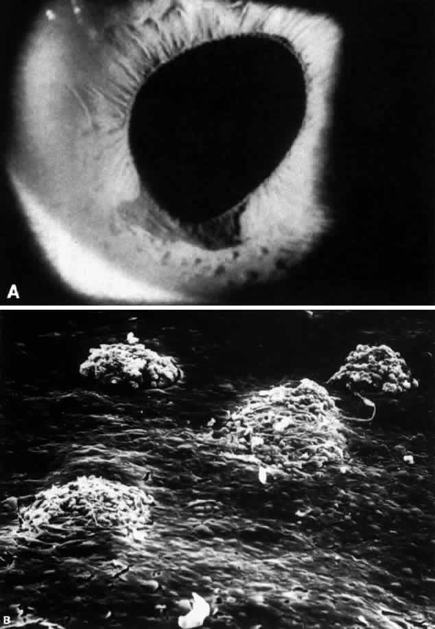 luetic). BACTERIAL AND FUNGAL KERATITIS Several different mechanisms may be responsible for increased intraocular pressure in patients with bacterial or fungal keratitis. As a consequence of the anterior uveitis accompanying these infections, inflammatory cells and debris may become trapped within the trabecular meshwork, compromising aqueous outflow. In the case of fungal keratitis, organisms may penetrate Descemet's membrane35 and contribute to occlusion of the meshwork. Pupillary block may develop as a result of a mass of inflammatory material and/or posterior synechiae secluding the pupil. Intense anterior chamber inflammation may result in the formation of peripheral anterior synechiae that, if extensive, may contribute not only to acute pressure elevation but also to persistent glaucoma after the inflammatory process subsides. HERPES SIMPLEX In a report from Moorfield's Eye Hospital, 28% of patients seen with herpes simplex keratouveitis had elevated intraocular pressure.36 None of the patients with elevated pressure had primary ocular herpes. Of those with elevated pressures, 54% had disciform keratitis and 40% had stromal keratitis, in both cases usually accompanied by anterior uveitis.36 Although gonioscopy was difficult acutely, none of these patients was found to have an anatomically abnormal angle when examined later in the disease course.36 Mechanisms of pressure elevation include inflammation and edema of the trabecular meshwork itself, inflammatory cells and fibrin obstructing outflow channels, and increased aqueous viscosity.36-38 Corticosteroids are usually required in the treatment of stromal or disciform keratouveitis and are helpful for control of both the corneal and anterior chamber inflammation. Concomitant topical antiviral agents are generally administered to minimize the likelihood of epithelial recurrence of herpes. ß-Adrenergic blockers and carbonic anhydrase inhibitors are the best choices to decrease intraocular pressure until control of the inflammation is achieved. Ten percent of the patients in the above series eventually developed glaucomatous field defects, and 4% ultimately required filtering surgery.36 HERPES ZOSTER Elevated intraocular pressures were noted in 16% of patients with ocular manifestations of herpes zoster ophthalmicus.39 All of these patients also had uveitis. Those patients treated promptly with topical corticosteroids had normalization of intraocular pressure. Mechanisms of pressure elevation are similar to cases of herpes simplex keratouveitis and relate to inflammatory cells and debris obstructing an already inflamed trabecular meshwork.40,41 In zoster, there may also be extensive loss of pigment granules from the iris that contributes to occlusion of the meshwork.40 The pressure elevation often responds to suppression of intraocular inflammation with frequently administered topical corticosteroids, which may be required for a long period and often must be tapered slowly to avoid rebound inflammation and pressure elevation. Contrary to the case with herpes simplex, there is no concern of corticosteroid-induced viral reactivation with herpes zoster. Otherwise unexplained late pressure elevations while using corticosteroids should raise the possibility of corticosteroid-induced glaucoma. In patients with severe ocular herpes zoster there may be decreased aqueous production as a result of inflammation and/or necrosis of the ciliary body.40,41 Intraocular pressure in an individual case will depend on the balance between aqueous production and the limitation to outflow resulting from intraocular inflammation. SYPHILITIC INTERSTITIAL KERATITIS Interstitial keratitis occurring as a manifestation of congenital syphilis most commonly occurs from ages 5 to 20.42 The acute phase of interstitial keratitis is almost invariably accompanied by iridocyclitis,42 which may cause an elevation of intraocular pressure. It has been recognized that patients who previously had interstitial keratitis are prone to develop glaucoma many years later; 16% of patients in one series developed late glaucoma.43 The average period between the interstitial keratitis and presentation with this late form of glaucoma was found to be 27 years.44 Two subgroups of patients with late glaucoma have been identified.45 One group presents with chronic pressure elevation and normal depth chambers. Gonioscopically, these patients have postinflammatory peripheral anterior synechiae, with the open portions of the angle having a “dirty” appearance. Patients with this variety of glaucoma have generally responded poorly to antiglaucoma medications but have done well after filtering surgery.45 These patients have probably sustained postinflammatory damage to the trabecular meshwork. The second group of patients presents with angle closure, which is occasionally acute but more commonly subacute. These patients have smaller anterior segments and shallow anterior chambers. Iridectomy has resolved the glaucoma in some cases, although others have required additional medical treatment or filtering surgery. It is uncertain whether the anterior segment size was affected by the congenital syphilis or by the interstitial keratitis.45 |