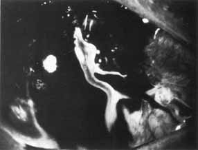 detectable elevation of the conjunctiva. The presence of an external wound fistula is demonstrated by Seidel's test. Streaming of clear aqueous humor into the fluorescein-stained tear film positively identifies the leak (Fig. 1). For detection of a small or subtle leak, several aspects of the test are important. First, the concentration of fluorescein in the tear film must be very high. The patient's lids are held open, and a moistened fluorescein-impregnated paper strip is applied over the area in question. Alternatively, a drop of 2% fluorescein solution may be placed on the eye. Second, because aqueous humor may leak from the wound intermittently when the intraocular pressure is extremely low, digital pressure should be applied if a leak is not immediately apparent. An external wound fistula should be repaired promptly to prevent endophthalmitis. Occasionally, placement of a pressure patch (and treatment with acetazolamide and timolol to reduce flow through the fistula) will allow the defect to heal. A bandage contact lens or Simmons shell may also be useful. After closure of the fistula, the intraocular pressure may rise to very high levels because the trabecular meshwork may not start functioning immediately. An inadvertent filtering bleb should be repaired if the resulting hypotony is causing visual impairment. Perforation of the sclera may occur at the time of surgery, which, if undetected, could lead to chronic hypotony. This may occur from the retrobulbar needle, especially in an eye with a posterior staphyloma.9 The superior rectus bridle suture may perforate the sclera, leading to hypotony from external filtration or resultant retinal detachment.10–12 This complication is more likely to occur if the eye is very soft just prior to surgery. |