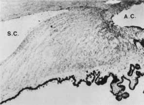 Experimental studies in rabbits have encountered the same confusing coexistence of iridocyclitis, making interpretation difficult.41,42 In monkeys, who respond to surgery with minimal inflammation, experimental ciliochoroidal detachment with Ringer's solution or autologous serum caused a fall in intraocular pressure of 7 mmHg, but the aqueous humor flow remained normal.43 A detachment created by silicone oil resulted in no lowering of the intraocular pressure despite of a high detachment of the ciliary body and choroid. It was postulated that ciliochoroidal detachment results in hypotony because of increased uveoscleral outflow. The pathway from the anterior chamber to the supraciliary space is shortened, and edematous enlargement of the intermuscular spaces of the ciliary body would enhance such fluid movement (Fig. 5). Hyposecretion observed clinically must thus be due to concurrent iridocyclitis and not ciliary body detachment, as is commonly believed. In addition, serous choroidal detachment is seen in Harada's disease, yet the intraocular pressure is normal in these eyes.44 Proteinaceous suprachoroidal fluid exits the eye by way of the emissarial channels of the sclera45,46 because it cannot be reabsorbed into the choroidal vessels.3 It is unclear why suprachoroidal fluid in the ciliochoroidal space is obstructed. In hypotony, the pressure drop across the sclera is reduced and may delay the outflow of suprachoroidal fluid. Fortunately, most ciliochoroidal detachments resolve spontaneously without untoward effect. In cases where the detachment persists, no specific nonsurgical therapy exists. The usual clinical practice is to administer topical (and occasionally systemic) corticosteroids and topical cycloplegics to prevent synechiae. If the intraocular pressure could be raised, more rapid resolution of the detachment would occur. Occasionally, increased fluid intake is used to cause increased aqueous formation. Corticosteroid therapy may improve aqueous production and reduce uveoscleral outflow by reducing iridocyclitis. Paradoxically, acetazolamide has been reported to speed absorption of suprachoroidal fluid.47 Perhaps its vasoconstrictive effects48 reduce the transudation of fluid across the choroidal vessels. If nonsurgical efforts fail to resolve the ciliochoroidal detachment and hypotony, and if corneal decompensation develops, prompt drainage of suprachoroidal fluid with reconstitution of the anterior chamber is indicated.49 Improvement of hypotony usually follows removal of suprachoroidal fluid.40,50 Sodium hyaluronate may be used to prevent recurrence of the flat anterior chamber.43,44 In intractable cases, suturing the ciliary body to the sclera may be curative.53 |