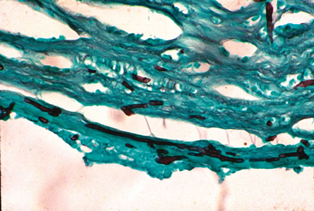 Certain direct fluorescent stains may be used in lieu of Gram's strain for detection of bacteria. In particular, acridine orange has a much higher sensitivity for detection of bacteria than Gram's stain, and has the additional advantage of staining fungi more reliably than Gram's stain. The drawback of these direct fluorescent stains is the necessity of a fluorescent microscope for detection of the fluorescent signal. Positive specimens should be secondarily strained with Gram's stain to identify the detected pathogen. Commercial monoclonal or polyclonal antisera can be used to identify specific organisms by indirect immunofluorescence. In ophthalmology, this is commonly used for Chlamydia species.1 Because a specific antiserum must be used for each suspected organism, the requesting physician must communicate with the clinical microbiology or pathology laboratory in order to request these tests. FUNGI The most rapid technique for visualizing yeast or filamentous fungi is the potassium hydroxide (KOH) preparation. The scraping or swab is treated with 10% KOH in dimethyl sulfoxide. The strong base dissolves keratinized tissue (such as cornea), but the cell walls of fungi are resistant to dissolution. Both budding yeast and filamentous fungi can be visualized. Other staining methods also have high sensitivity for detection of yeast and fungi, including Giemsa stain, Gomori's methenamine silver (GMS), India ink staining, or periodic acid–Schiff (PAS) stain (Fig. 2). Fungi can also be identified on some Gram-stained samples.