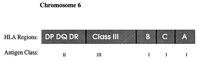 and memory.1 All immune-related cells arise from a common pluripotential stem cell. This stem cell gives rise to committed stem cells for the lymphoid and myeloid series. Under the influence of particular colony-stimulating factors, the lymphoid and myeloid stem cells give rise to various cell types. The lymphoid cell line consists of lymphocytes such as T cells, B cells, and large granular lymphocytes (see Third Population Cells). The myeloid cell line consists of nonlymphoid cells such as erythrocytes, monocytes/macrophages, polymorphonuclear granulocytes (neutrophils, basophils, eosinophils), megakaryocytes/platelets, and mast cells. The bone marrow is the site of maturation of most of these cell types. A major exception is the T cell, which leaves the bone marrow and matures under thymic influence. Before continuing with a discussion of immune cell types and function, two topics will be reviewed: the major histocompatibility gene complex (MHC) and cell markers. MAJOR HISTOCOMPATIBILITY GENE COMPLEX Alloantigens are antigens that differentiate between members of a species (i.e., intraspecies). The histocompatibility antigens are alloantigens that play a role in the rejection of allogeneic tissue grafts. These surface molecules are coded in the human genome in the major histocompatibility gene complex (MHC). This localized group of genes codes for cell surface antigens, which play a major role in immunity, self-recognition, and tissue graft rejection. Human leukocyte antigen (HLA) is the name for the human MHC. The HLA region is located on the 21 region of the short arm of chromosome 6 (Fig. 1). In addition, there are minor histocompatibility antigens coded throughout the genome that play a definite but less well-defined role in the immune response. There are three classes of gene products of the MHC.2 Class I Molecules These antigens are expressed on virtually all nucleated cell surfaces, including B cells, T cells, and platelets, but not on mature red blood cells. They are products of the HLA-A, HLA-B, and HLA-C loci. Each individual has six serologically defined HLA-A, HLA-B, and HLA-C antigens, three from each parent. Class II Molecules These antigens are a product of the HLA-D region, which includes the subregions -DR, -DQ, and -DP. The genes of the HLA-D region that code for class II determinants are known as immune response (Ir) genes. Class II molecules, often called Ia (immune-associated) antigens, are expressed on antigen-presenting cells (monocytes/macrophages, Langerhans cells, dendritic cells), B lymphocytes, and activated T lymphocytes. Immune suppressor (Is) genes also exist in the HLA-DQ region. Class III Molecules These antigens include the complement components C4, C2, and factor B. Although HLA antigens do not directly cause disease, certain HLA types are known to predispose individuals to particular autoimmune diseases (e.g., HLA-B27 and ankylosing spondylitis). The mechanism is not clearly defined but involves immunologic alteration. SURFACE MARKERS Cell surface molecules are identifiable by specific monoclonal antibodies. The CD system is presently the standard nomenclature (CD stands for cluster designation). Surface markers can be used to differentiate immune cell types, stages of maturation of a given immune cell type, and immune cell activation. T-Cell Markers Pan-T cell markers include CD2, CD5, and CD7 (Table 1). CD2 is responsible for the binding of T cells to sheep erythrocytes forming rosettes (B cells cannot do this). This was formerly the major means of identification of T cells.