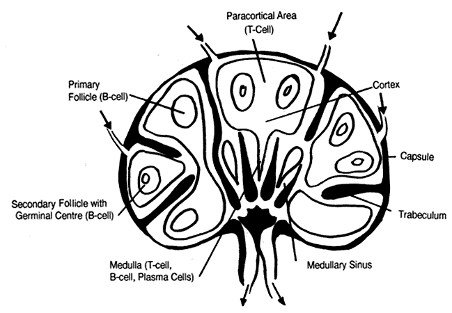 The T-cell antigen receptor (TCR) is the definitive T-cell marker.3 There are two types of TCR, TCR1 and TCR2, the latter being the most common (present on 95% of T cells). TCR2 is composed of two peptide chains, alpha and beta, linked to form a heterodimer. This is closely associated with CD3 molecules (CD3 subunit), forming the TCR2 receptor complex. TCR1 is similar in structure to TCR2 but contains gamma and delta polypeptides. The TRC2 group can be divided into those cells that are CD4+ (helper T cells) and those that are CD8+ (suppressor/cytotoxic T cells). Helper T cells recognize antigen associated with class II molecules. The functions of CD4+ cells include promotion of T-cell and B-cell differentiation, regulation of suppressor/cytotoxic T-cell proliferation/function, and production of lymphokines (see below). They also play a role in regulation of erythropoiesis. Those TCR2 cells associated with CD8+ are suppressor/cytotoxic T cells. These cells recognize antigen associated with class I molecules and function as cytotoxic cells. Also, they act as suppressors of T- and B-cell function. B-Cell Markers The classic B-cell marker is surface immunoglobulin produced by the cell itself. These immunoglobulins act as B-cell receptors for antigen. On circulating B cells, the surface immunoglobulins are predominately IgM and IgD molecules, and, for a given cell, they share the same antigen specificity. CD19, CD20, and CD22 are presently the markers commonly used to identify B cells.3 Other markers found on B cells include MHC class II antigens, which are important in cooperation with T cells, complement receptors CR1 (for C3b) and CR2 (for C3d), CD5 (also expressed on all T cells), and surface receptors for the Fc portion of IgG. CELLS OF THE IMMUNE SYSTEM T Lymphocytes T cells regulate the immune response, are the major players in cell-mediated immunity, and induce antibody production by B cells. T-cell precursors arise from stem cells in the yolk sac, the fetal liver, and, later in prenatal development, the bone marrow. These immature cells migrate to the thymus, where maturation follows. Mature lymphocytes migrate via the circulation to the spleen, lymph nodes, tonsils, and unencapsulated lymphoid tissue. The latter includes mucosa-associated lymphoid tissue (MALT), such as that in the gut (GALT), bronchi (BALT), and conjunctiva (CALT). Lymphocytes make up 20% of the total circulating leukocyte count. Mature T lymphocytes make up 70% to 80% of peripheral blood lymphocytes. In lymph nodes, T cells reside in deep paracortical areas around B-cell germinal centers (Fig. 2) and in periarteriolar areas of white pulp of spleen. The T-cell pool is maintained throughout the years by antigen-driven expansion of long-lived T cells that reside in the peripheral lymph organs. There are two major subsets of T lymphocytes--helper T cells and suppressor/cytotoxic T cells. HELPER T CELLS. Helper T cells are CD4+ lymphocytes. They are class II restricted (i.e., they respond to antigens presented in conjunction with class II molecules on the surface of antigen-presenting cells [APC], such as macrophages). The CD4 molecule has an adhesive function and binds to the class II (HLA-DR, -DQ, or -DP) molecule on the surface of the APC. This enables TCR to bind to the antigen in a stable fashion. Helper T cells function as regulator/modulator cells. Those CD4+ cells that display the helper function (i.e., positively influence the immune response of T cells and B cells) are CD29+ . These cells induce B cells to produce antibodies. A subset of CD4+ cells that are CD45R+ display the suppressor-inducer function (i.e., induce suppressor/cytotoxic function in CD8+ cells, which results in suppressed antibody production by B cells).4 SUPPRESSOR/CYTOTOXIC T CELLS. Suppressor/cytotoxic T cells are CD8+ and are class I restricted (i.e., cytotoxic T cells recognize antigens presented in association with class I [HLA-A, -B, or -C] molecules). CD8+ binds to the class I molecule of the antigen-presenting cell. This stabilizes TCR binding to antigen on the surface of the antigen-presenting cell. When this condition is met, lysis of the target cell can occur (see below). These cells play an important role against intracellular parasites and viruses. Suppressor cells may act on either T cells or B cells and perform a down-regulating function. Suppressor/cytotoxic T cells may be activated by helper T cells that are CD45R+ (see suppressor-inducer function above). No surface markers are yet known that distinguish between CD8+ suppressor and cytotoxic cells. Helper T cells constitute 45% of circulating lymphocytes and suppressor/cytotoxic T cells 25% of circulating lymphocytes, giving a normal helper T/suppressor T ratio of 1.8:1. B Lymphocytes B cells are responsible for humoral immunity (i.e., that arm of the immune response mediated by antibodies). B lymphocytes arise from precursor cells in the bone marrow (in birds, in the bursa of Fabricius, hence the name B cell). Mature B cells express surface immunoglobulins, which, as previously discussed, act as receptors for foreign antigen. Each B cell produces only one type of immunoglobulin heavy and light chain variable region; thus, each B cell has specificity for only one antigen. B cells constitute 10% to 15% of circulating lymphocytes. In lymph nodes, B cells are located in cortical germinal centers and medullary cords, where they are the principal cell type (see Fig. 2). B cells are located in primary and secondary germinal centers of the white pulp of the spleen. When mature unprimed B cells are stimulated by antigen, they either develop into plasma cells that produce antibody or become memory cells. This is known as the primary response. Memory cells are long lived and respond when re-exposed to the same antigen in the future, enabling an amplified secondary response. Memory cells have higher-affinity antigen receptors and are prone to make IgG earlier than unprimed B cells.5 Pl