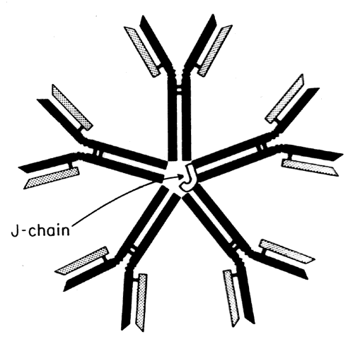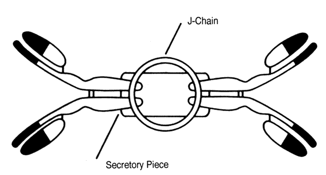 IGA. IgA constitutes 15% of total serum immunoglobulin. About 80% exists in a monomeric form, but a dimeric form exists. It is the major class of immunoglobulin in secretions such as tears, saliva, milk, and those of the respiratory and gastrointestinal (GI) tract (secretory IgA). Secretory IgA is a dimer consisting of two IgA monomers joined by a J-chain and associated with a glycoprotein called the secretory piece (Fig. 8). The secretory piece may facilitate the transport of IgA through mucosal surfaces and make the IgA molecule more resistant to degradation by proteolytic enzymes present in external secretions. There are two IgA subtypes; IgA1 is found mostly in serum, whereas IgA2 is found more in secretions. IgA fixes complement via the alternative pathway. IgA possesses potent antiviral activity in man by prevention of viral binding to respiratory and GI epithelial cells. Secretory IgA is the main immunoglobulin in the tear film, and IgA is found regularly in the superficial conjunctival epithelium in various types of conjunctivitis.10
