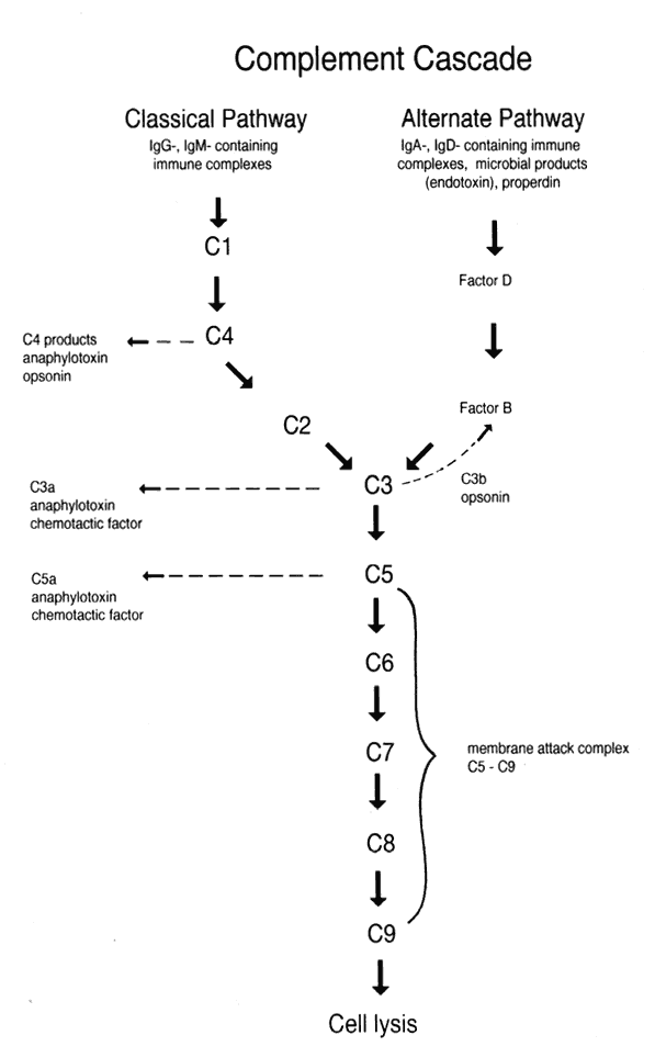 IGD. IgD is found in minimal amounts in serum. Like IgM, it acts as a major receptor for antigen on the surface of B cells. IGE. IgE is present in low amounts in serum. It binds to the surface of basophils and mast cells via its Fc region and acts as an antigen-binding site. Cross-linking of surface IgE by antigen promotes mast cell mediator release (type I hypersensitivity reaction). IgE plays a major role in allergy and immunity to helminths. COMPLEMENT The complement system comprises a cascade of about 25 soluble serum proteins. Each acts as asubstrate for the preceding protein (enzyme) in the cascade, then acts as an enzyme on the next protein in the sequence. There are two major complement pathways, the classic and alternative pathways. In the classic pathway, which is the more rapid and efficient of the two pathways, IgG- and IgM-containing antigen-antibody complexes activate C1, causing a cascade of activation in the following order: C4, C2, C3, C5, C6, C7, C8, and C9 (Fig. 9). The alternative pathway is a slower system in which C3 is activated by microbial products (e.g., endotoxin), properdin, and/or IgA- or IgD-containing immune complexes. With C3 activation, the cascade continues in a manner similar to that of the classic system.