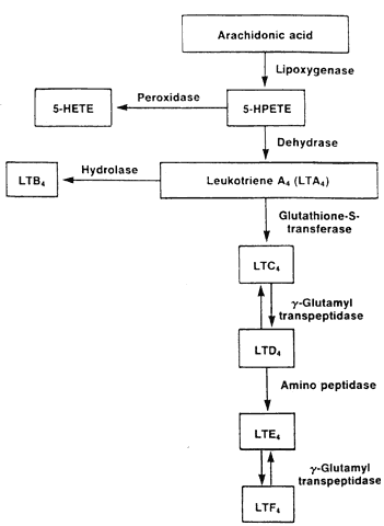 ALLERGIC RHINOCONJUNCTIVITIS (HAY FEVER) Allergic rhinoconjunctivitis is the most common ocular allergic disease.35 This condition usually begins early in life. There is often a family history of allergy. There may be a personal history of other allergic disease (e.g., asthma). Pathophysiology In predisposed individuals, airborne environmental antigens (allergens) contact the conjunctival and/or nasal mucosa, stimulating a type I hypersensitivity reaction (a local anaphylaxis). Mast cells and basophils possess high-affinity surface receptors for the Fc portion of IgE; thus, IgE coats the surface of these cells. Allergen binds to this surface IgE on conjunctival basophils and mast cells. Bridging occurs, resulting in a change in membrane permeability and influx of calcium. Degranulation follows (i.e., release of preformed mediators from secretory granules such as histamine, proteoglycans [heparin], and proteases [tryptase]). Eosinophilic chemotactic factor of anaphylaxis (ECF-A), responsible for influx of eosinophils, is also released by mast cells. Also, de novo synthesis of inflammatory mediators occurs. Calcium influx activates phospholipase A2, which liberates arachidonic acid from membrane-bound phospholipids. This results in the formation of eicosanoids such as prostaglandins via the cyclo-oxygenase pathway and leukotrienes via the lipoxygenase pathway (Figs. 11 and 12). Platelet activating factor is produced from modified phospholipids.