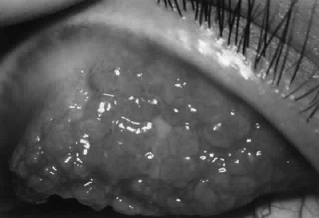 Pathogenesis Several factors may be involved in pathogenesis. Mechanical irritation by the contact lens probably plays a role, especially lenses with thick edges, as seen in myopes. Accumulated deposits of protein, lipid, and minerals on the contact lens surface act as a source of antigens that can sensitize the conjunctiva. Chronic microtrauma by the lens and its deposits disrupts tight junctions between conjunctival epithelial cells, allowing allergens to penetrate. Damage to conjunctival epithelial cells induced by contact lenses and their deposits stimulates the production of neutrophil chemotactic factors, which play a role in the inflammatory response.83–85 Certain lens polymers (e.g., hydrogels) are more prone to accumulation of deposits. Also, larger lenses provide a greater surface area for deposits to accumulate and a greater surface area for antigens to contact the conjunctiva. Long wearing times allow a longer period of conjunctival exposure to antigen. Meibomian gland dysfunction may play a role in deposit formation and contact lens intolerance.86–88 The allergic mechanism in GPC is probably a basophil-rich delayed hypersensitivity (type IV) reaction with a possible IgE (type I) humoral component.82,89 An abnormal distribution of inflammatory cells is seen. There are mast cells in the conjunctival epithelium (not seen in normals) and increased numbers of mast cells in the substantia propria. Basophils and/or eosinophils, not usually seen in normal conjunctiva, may be found in increased numbers in both the epithelium and substantia propria.82 Although tear histamine levels are normal, tear immunoglobulins are increased.90,91 As with vernal, eosinophil major basic protein, which stimulates mast cell degranulation and possesses cytotoxic effects that may enhance the conjunctival inflammatory reaction, is found in increased amounts in the conjunctiva (but not in tears as in vernal) and undoubtedly plays a role.64 Tear tryptase levels in patients with GPC, a measure of mast cell degranulation, may provide an early marker for this disease.92 Treatment Asymptomatic patients with signs only or those with minimal symptoms and signs may not need to discontinue lens wear if good lens hygiene is maintained; these patients may take topical cromolyn 2% or 4% q.i.d. with their contact lenses in place to maintain control. Initial treatment of the symptomatic patient is discontinuation of lens wear. Ocular lubricants are helpful during this time period. Symptoms may improve within 2 or 3 days, but lenses should not be resumed until about 1 week after all mucus, redness, and irritation are gone. Papillae may last longer, but contact lenses can be resumed if there is no fluorescein staining. Topical cromolyn sodium or corticosteroids are usually not required if lens wear is stopped but may be helpful in more severe cases. The nonsteroidal anti-inflammatory agent suprofen used topically has also been shown to be effective in GPC.93 When contact lenses are resumed, proper lens hygiene must be stressed. This is especially important because as a group, contact lens wearers with GPC are neglectful with lens care. Hydrogen peroxide cleaning systems (preferably nonpreserved) and nonpreserved saline are best for patients with GPC. Cold disinfection systems increase the possibility of exposure to sensitizing agents and should be avoided. Thermal disinfection bakes deposits on the lenses and thus is also less favorable for patients with GPC. Enzymatic cleaning, particularly papain, is superior to surfactant cleaning.82 Whereas the usual contact lens wearer uses enzymatic cleaners once a week and surfactant cleaners daily, the patient with GPC needs to use enzymatic cleaners several times a week, and in some cases daily. Maximum wearing time should be reduced. A change to a soft contact lens made of a different polymer may be required; in particular a nonionic, low-water-content polymer is ideal. Another alternative is to use disposable soft contact lenses (e.g., Acuvue) on a daily-wear basis, using regular cleaning, as noted above, and discarding the lens after 1 to 2 weeks.94 If a recurrence occurs after resumption of lens wear, there must be at least a 1-month period off lenses, preferably 3 months. Again, a soft contact lens of a different polymer can be tried, or the patient can switch to a gas-permeable semi-rigid lens. Some will benefit from topical cromolyn 2% or 4% four times a day with the contact lenses in place to prevent recurrences. ATOPIC KERATOCONJUNCTIVITIS This entity usually develops in patients with a personal or family history of atopic disease, such as atopic dermatitis, asthma, perennial rhinitis, urticaria, or food allergy. Asthma and atopic dermatitis are the most common atopic diseases in patients with atopic keratoconjunctivitis.95 Atopic keratoconjunctivitis is seen in 25% of all patients with atopic dermatitis.96 When there is concurrent atopic dermatitis, it can be isolated to the periocular area or can be found elsewhere. Eczema may have been present in infancy or childhood but has long since resolved. Atopic dermatitis and atopic keratoconjunctivitis may also be associated with the hypergammaglobulinemia E syndrome.97 Atopic keratoconjunctivitis is a bilateral, usually symmetric disease. It can occur in early childhood but more commonly begins in the late teens and early twenties. The peak incidence is age 30 to 50 years. Its onset is typically later than that of atopic dermatitis alone and is also later than that of vernal keratoconjunctivitis. Atopic keratoconjunctivitis usually will eventually settle but does so gradually and can leave serious ocular sequelae. Seasonal exacerbations occur in about one third of patients, although there does not appear to be a particular season more prone to exacerbations.95,98 Symptoms may be perennial. Patients may be able to identify particular allergens that stimulate flare-ups, common ones being animals, dusts, and foods. Usual s