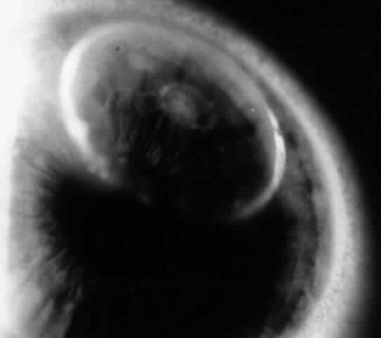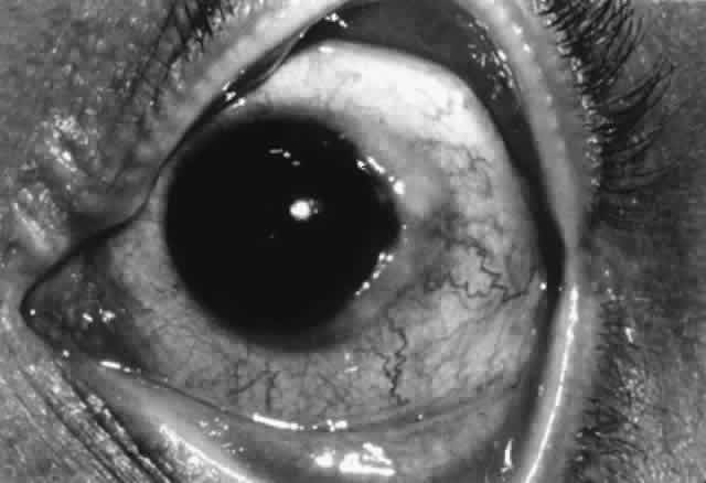 In the limbal form, papillae are located on the bulbar conjunctiva at the corneal limbus, usually superiorly, but they can involve the limbus elsewhere (Fig. 14). These papillae often have a gelatinous appearance; they may coalesce and form a ridge along the limbus. There may be associated micropannus formation. Small, fine white dots may be seen on the limbal papillae; these are Horner-Trantas' dots and represent focal collections of eosinophils (Fig. 15). Horner-Trantas' dots are usually seen at the superior limbus but can be seen elsewhere on the limbus and on the bulbar and tarsal conjunctiva. The limbal and palpebral forms of vernal can coexist. The limbal form is more common in blacks.