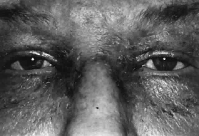 CICATRICIAL PEMPHIGOID Cicatricial pemphigoid is a systemic autoimmune disease affecting the basement membrane zone of the skin and mucous membranes that is characterized by recurrent blisters or bullae and subsequent scar formation.242 Cicatricial pemphigoid is typically a disease of the elderly, with an age range of 20 to 87 years.243 Skin involvement is less frequent than mucous membrane involvement, being present in 9% to 24% of cases. Mucous membrane involvement may affect the conjunctiva, nose, mouth, pharynx, larynx, esophagus, anus, vagina, and urethra. Oral lesions are found in 91% of cases. The conjunctiva is affected in 70%.244,245 Ocular cicatricial pemphigoid (OCP) is a bilateral chronically progressive condition punctuated by exacerbations of activity, resulting in conjunctival cicatrization. Ocular manifestations include subconjunctival fibrosis, fornix foreshortening, symblepharon formation (Fig. 25), obstruction of the ducts of the main and accessory lacrimal glands, meibomian gland obstruction, and lid malposition. Exposure and keratitis ensue, the ultimate result being corneal scarring and ulceration and eventual blindness.