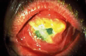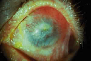 Obliteration of the lacrimal puncta and canaliculi by fibrosis may cause epiphora in some patients. Destruction of conjunctival goblet cells and fibrotic obstruction of the ducts of the lacrimal and accessory lacrimal glands may result in a dry eye condition similar to CP. In severe cases, keratinization of the conjunctival and corneal epithelium may be found. The dry eye condition, entropion with trichiasis, and lagophthalmos with exposure may result in corneal complications that include punctate erosions, pannus, ulcers, opacification, and even perforation (Fig. 17).100–102