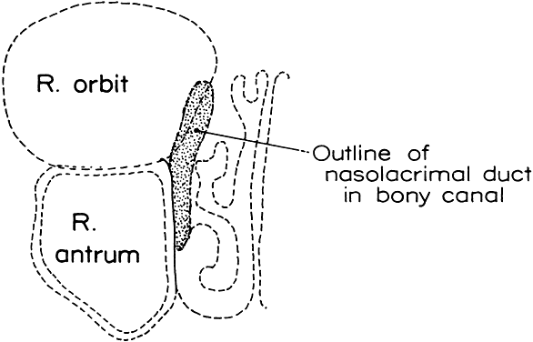 DACRYOSTENOSIS Dacryostenosis is a common condition in which the extreme end of the nasolacrimal duct underneath the inferior turbinate fails to complete its canalization in the newborn period; it produces clinical symptoms in 2% to 4% of newborns. In most instances, the obstruction is a small membrane at the end of the nasolacrimal duct that persists because of failure of complete canalization of the nasolacrimal duct. Other rarer types of congenital occlusion of the nasolacrimal duct and canal may occur if the epithelial cords have migrated within the mesoderm and do not open immediately under the inferior turbinate. Blind pouches can occur within the turbinate itself. A bony obstruction is often found under the inferior turbinate, and in some cases the epithelial cord migrates laterally so that the nasolacrimal canal ends in a blind pouch in the lateral wall of the nose.17,18 There are normal variations in the position of the opening of the nasolacrimal duct under the inferior turbinate. The nasal ostium of the duct, at the highest portion of the inferior meatus within the vault beneath the inferior turbinate, is usually wide open. It may be puckered, slitlike, or grooved down the lateral wall of the nose or have a puncturelike appearance in the vault of the turbinate (see Fig. 5). ABSENCE OF VALVES The fold normally present at the end of the nasolacrimal duct or valve of Hasner may be absent, in which case pneumatoceles of the sac may occur and nose blowing may cause retrograde passage of air. If the valve of Rosenmuller is also absent, it is possible to blow air from the nose into the eye, and nosebleeds may produce bloody tears.19 ANOMALIES OF THE SAC Although diverticuli of the lacrimal sac may occur, a congenital fistula of the lacrimal sac, which has been termed lacrimal anlage duct by Jones, is more common (Fig. 7).19 This anomaly has been described by others and in some cases is found to be autosomal dominant and may coexist with thalassemia. It undoubtedly is the result of canalization of a strand of epithelial cords that extends from the sac to the skin surface. The fistulas often have to be completely excised to prevent drainage of tears externally on the skin.