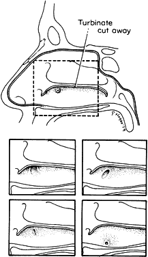 Attention is then directed to the undersurface of the inferior turbinate, which has previously been vasoconstricted with combined pediatric oxymetazoline hydrochloride (Afrin) and pediatric Neo-Synephrine 1/8% nasal sprays. A thin periosteal elevator is slid under the turbinate and is rubbed against the probe, which has been passed down through the nasolacrimal duct. It should be noted that the probe in the lacrimal duct moves as it is touched, and a metal-on-metal grating is felt and also heard (“see it, hear it, feel it”). If the turbinate is compressed over the probe, a twist of the periosteal elevator fractures the turbinate inward and opens the nasolacrimal duct (Fig. 15). The probe and the periosteal elevator are then withdrawn, and fluorescein-stained saline is irrigated into the punctum. It should easily travel down the canaliculus, lacrimal sac, and nasolacrimal duct and can be aspirated from the nasal cavity with suction apparatus. The patency of the membranous lacrimal conduit is thus confirmed.