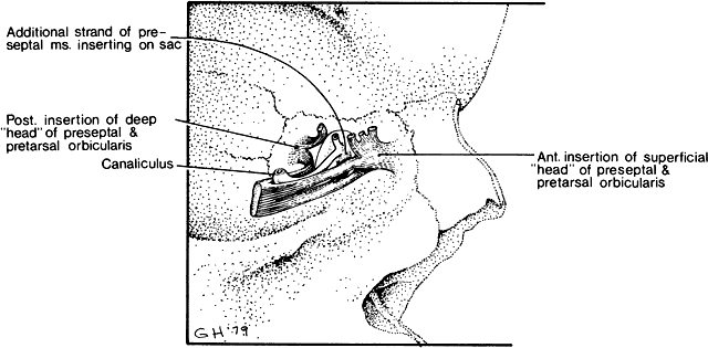 lacrimal disorders. The tear film travels across the surface of the globe and eyelids, enters the puncta/ampulla, passes through the canaliculi, and enters the lacrimal sac/nasolacrimal duct/nasal passages. This schema is of course oversimplified, because much of the tear film is likely “eliminated” by direct evaporation or absorption at the level of the lacrimal sac. The first key physiologic point to understand, however, is that the lacrimal outflow system is based on an active, dynamic pumping mechanism. It has long been noted that the blinking mechanism readily drains tears even with the head held in an inverted position. When the palpebral blink mechanism is impaired, however, epiphora is common, such as in patients with facial paralysis. Although multiple mechanisms may contribute to lacrimal outflow, present evidence suggests that the most important factor is the active palpebral-canalicular pump. This theory is based on the cumulative works of Doane,5 Rosengren,6 Frieberg,7 Chavis and colleagues,8 and Maurice.9 the blink mechanism with high-speed photography. Carbon particles were used to photograph the actual flow of the precorneal tear meniscus. The important findings of this work are summarized as follows. With the eyelids open before the start of a blink, the canaliculi are already filled with tears. As the upper lid descends at the start of a blink, the medial portion of the eyelids around the puncta elevates. The upper and lower puncta come into forceful contact by the time the eyelids are only halfway closed. This important event occludes the puncta such that the remaining portion of the blink acts to compress the canaliculi and lacrimal sac, thus forcing the contained fluid into the nasolacrimal ducts and nasal passages. The volume of fluid within the lacrimal outflow system is at its minimum at the point of maximum lid closure during a blink. As the eyelids begin to open, the muscular compressive force terminates and the elastic walls of the canaliculi and lacrimal sac attempt to restore their original shape. The puncta remain occluded such that a partial vacuum forms within the membranous lacrimal conduit. As the eyelid-opening phase of the blink continues, the two lacrimal puncta pop open and expose the adjacent lacrimal lake to this partial vacuum. Tears rapidly flow into the canaliculi during the 1- to 3-second interval immediately after the blink. Once again, the canaliculi fill with fluid so that the pumping action of the next blink can continue the lacrimal elimination cycle. In addition to the important role of the active palpebral-canalicular pump, other factors contributing to lacrimal elimination may include physical forces such as gravity and capillary attraction of the tears, reservoir drainage into the lacrimal sac (so-called Krehbiel flow), microcilliation in the nasolacrimal duct, and finally evaporation of tears from the ocular surface and absorption of tears by the lacrimal sac mucosa. The “lacrimal pump” theory is widely noted in the ophthalmic literature and is based on classic anatomic studies by Jones,10 describing tendinous and muscular insertions exerting their action on and around the lacrimal sac. The Jones theory holds that with closure of the eyelid margin, the eyelid fissure moves nasally and forces tears toward the area of the puncta and interface between the lids, conjunctiva, and caruncle in the area of the lacrimal lake. With relaxation of the eyelids on opening, the canaliculi and ampulla, which have been compressed by the pretarsal deep and superficial muscles because of their elasticity, create a negative pressure in the ampulla-canalicular system, causing tears to be sucked into the puncta. When the eyelids are closed again, the tears, which previously entered the ampulla-canalicular system when the eyelids were opened, are squeezed into the lacrimal sac. It is also theorized that the muscular pull of the preseptal orbicularis muscles on the lacrimal sac creates a negative pressure within the sac. With the eyelids open, the sac is normally collapsed. The valves within the sac and nasolacrimal duct prevent retrograde passage of tear flow in normal situations. This proposed lacrimal sac pumping mechanism is based on anatomic studies and likely does not have a large role in normal lacrimal elimination, because the system functions quite well with the lacrimal sac slit completely open, as is the case after dacryocystorhinostomy (DCR). Traditional teachings have previously held that the lower canalicular drainage system was far more important than the upper system. This old wives' tale is completely incorrect. Studies by White and colleagues11 and Daubert and associates12 have demonstrated equal tear flow between the upper and lower canalicular systems using radioactive dacryoscintigraphy flow studies. Linberg and Moore13 evaluated the clinical symptoms associated with alternate monocanalicular occlusion of the upper and lower puncta. They found that approximately 50% of patients experience mild intermittent symptoms of epiphora associated with experimental monocanalicular obstruction. The symptoms were identical whether patients' upper canalicular system or lower canalicular system was occluded. Meyer and associates14 studied fluorescein dye disappearance in 20 subjects and found that 90% of patients showed minimal or no impairment with monocanalicular (either upper or lower) obstruction. A number of important clinical principles can be derived from the physiologic information just provided. Present evidence supports the crucial role of the palpebral-canalicular pump mechanism in lacrimal elimination. All efforts should be made to preserve the lacrimal canaliculi. Repeated instrumentation of the lacrimal system or nasolacrimal duct probings are unlikely to help the underlying pathology and may in and of themselves injure the canaliculi and thus permanently impair lacrimal elimination. Very little can be done to restore scarred fib