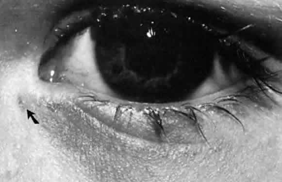 ANOMALIES OF THE PUNCTA Congenital atresia, supernumerary or double puncta, and congenital slits of the puncta all may occur from aberrations in the location of the epithelial cord and its opening to the surface epithelium. Lateral displacement of the puncta may occur in some congenital syndromes such as blepharophimosis. ANOMALIES OF THE CANALICULI Atresia or failure of canalization of the lacrimal canaliculi may occur in conjunction with punctal atresia. In many cases, particularly in patients with mesodermal dysplasia, the lacrimal canaliculi and puncta may be absent and a normal tear sac and nasolacrimal duct may be present but not connected to the eyelid surface. |