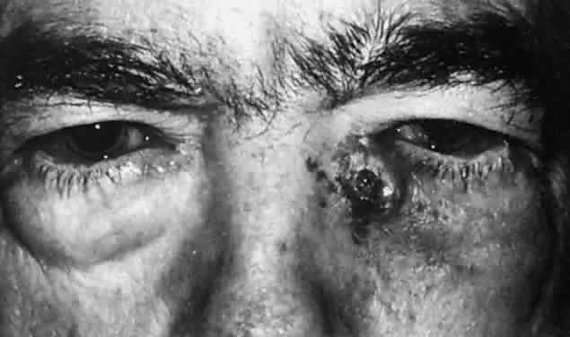 ATRESIA Isolated stenosis of the punctum with an intact and patent canalicular system distally may occur congenitally or as a result of cicatrizing inflammations, trauma, and senile atrophy associated with long-term drying in patients with ectropion. TUMORS Basal cell carcinomas occur most frequently in the inner canthal area and often involve the punctum, as may benign growths in this area. |
