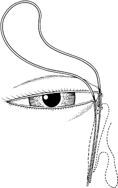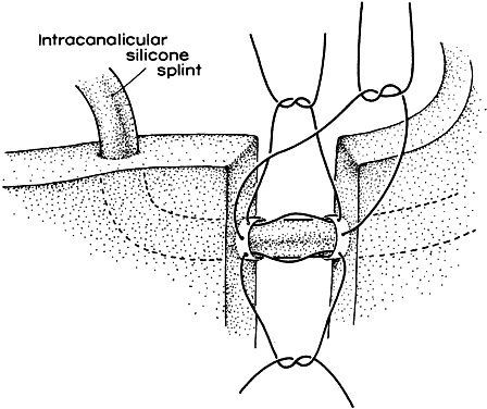 the correct therapy. EYELID/PERIOCULAR SURGERY In most patients with lower eyelid punctal malposition, the cause is excessive horizontal lower eyelid laxity. These malpositions are corrected with a simple lower eyelid horizontal tightening procedure performed at the outer canthus.68,69 These tightening procedures restore adequate horizontal tension to the lower eyelid and often correct any punctal ectropion. The tightening effect of surgery can be simulated with a piece of tape used to tighten the lids. This maneuver is helpful in predicting which patients may be helped by definitive surgery. In some patients, punctal ectropion can be corrected by medial transconjunctival tightening and rotation procedures.70,71 These medial rotational procedures rely on the excision of a diamond-shaped ellipse of conjunctiva and lower eyelid retractors from the retropunctal region. Suture closure of the cut edges of conjunctiva and lower eyelid retractors can be brought full thickness through the lid to enhance the rotational effect, as advocated by Tse.71 These medial spindle procedures for correction of punctal ectropion can be combined with lateral horizontal tightening procedures. Conjunctivochalasis is the term used to describe redundant epibulbar conjunctiva that is interposed between the globe and lower eyelid and protrudes over the lower lid margin.72 This redundant fold of conjunctiva interferes with the normal tear meniscus and can be seen to be draped over the lower eyelid punctum in affected patients. The treatment is surgical excision of a strip of redundant conjunctiva. Serrano and Mora have recommended that an inferior limbal peritomy be used to excise the redundant conjunctiva.73 This incision heals quite well and avoids scarring or retraction of the inferior conjunctival fornix. Other investigators have reported success with excision of a redundant crescent of epibulbar conjunctiva located 3 to 4 mm below the inferior corneal limbus.74,75 With either method, the surgeon must avoid overzealous excision of conjunctiva. PUNCTAL SURGERY Punctal stenosis is an underdiagnosed and relatively simple-to-treat cause of epiphora. The one-snip punctoplasty is successful in most cases.76 The follow-up treatment of patients undergoing punctoplasty is as important as the actual procedure itself. A one-snip punctoplasty may be performed with topical anesthesia, although we prefer a small local infiltration with lidocaine 2%. If the punctum is completely stenosed, a sharp probe may be necessary to initiate a small opening. This small punctal opening should then be gently dilated. A one-snip punctoplasty is performed with sharp Westcott's scissors. The Westcott's scissors are held perpendicular to the lid margin, and one blade of the scissors is introduced into the dilated punctum and ampulla. A vertically oriented snip opening approximately 2 to 3 mm long is made in the punctum along the tarsal conjunctival surface. The punctoplasty itself is a relatively simple procedure to perform. Proper postoperative care is important in maintaining the patency of the punctoplasty. It is often necessary to have a patient return two or three times during the first postoperative week to prevent reocclusion of the fresh punctoplasty incision. Gentle redilation of the punctoplasty with a lubricated dilator ensures that it heals in an open position. Patients are instructed to stretch their eyelid laterally several times a day to stretch open the recent punctoplasty. This simple one-snip technique with proper postoperative care for 1 week has a very high success rate. Traditional two-snip techniques rely on the use of two connecting snips made along the conjunctival side of the punctum, excising a triangular wedge of tissue. These two-snip techniques offer little advantage over a one-snip procedure combined with watchful postoperative care and redilatation. Three-snip procedures are potentially destructive to the lacrimal outflow apparatus and rely on two vertically oriented snips that are connected at their base by a third snip. We recognize the tendency for the three-snip procedure to be overaggressive and at present do not recommend this technique. In some patients, punctal stenosis may recur despite the implementation of proper punctoplasty techniques. In these cases, a repeat one-snip punctoplasty should be combined with silicone tube intubation of the lacrimal outflow system. The silicone lacrimal tubes serve as internal splints to maintain patency of the lacrimal punctum. The silicone tubes are relatively inert and may be left in place several months until the punctoplasty openings are deemed stable. This combination punctoplasty technique with silicone tube intubation is also useful for reconstructing punctal injuries or for lacrimal puncta that have been occluded surgically and have resulted in symptomatic epiphora. CANALICULAR SURGERY Lacerations As has been emphasized, it is important to repair upper as well as lower canalicular lacerations. Repair can be delayed for as long as 48 hours with the use of ice compresses, although prompt repair of these injuries is ideal.77 Local injections of small quantities of lidocaine with epinephrine and hyaluronidase (Wydase) at the time of repair can assist in reducing local tissue edema and maintaining hemostasis. For ease of examination of the tissues, especially with extensive injuries, general anesthesia may be preferable. Excessive amounts of local anesthetic should be avoided because they may distort the tissues. In most cases, surgical loupes (e.g., 3.0 to 3.5× ) magnification are quite adequate to perform the repair. In selected cases, an operating microscope can be used to help find the severed ends of the canaliculus. Internal splinting of the canaliculus with a soft, pliable material is mandatory to repair the laceration. End-to-end anastomosis of the canaliculi is ideal with 7-0 or 8-0 Vicryl sutures. It may, however, be quite difficult or impossible to suture 