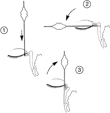 Silicone tube intubation can be performed under local or general anesthesia. In either case, the nasal mucosa and inferior turbinate are vasoconstricted with combined pediatric oxymetazoline hydrochloride (Afrin) and pediatric Neo-Synephrine 1/8% nasal sprays. The lacrimal punctum is gently dilated to allow passage of the Crawford probe and olive tip. In some patients, a small one-snip procedure is performed to allow easy entry and passage of the lacrimal probe and silicone tubing. The probe is lubricated with an ophthalmic antibiotic ointment and passed first vertically through the lower punctum into the lower canalicular system. With the lower lid held on stretch to avoid kinking of the canaliculus, the probe is then rotated 90 degrees so that it is in the horizontal plane. The probe is then advanced nasally until it enters the lacrimal sac and encounters the medial orbital wall. It is then rotated 90 degrees vertically, angled 15 degrees posteriorly, and advanced down through the nasolacrimal duct. The probe exits from underneath the inferior turbinate, normally at the junction of the anterior and middle thirds of the undersurface of the turbinate (Fig. 17). With the aid of a nasal speculum and a fiberoptic headlight, the surgeon should visualize the olive-tipped probe exiting from under the inferior turbinate. It is helpful for the surgeon to stand on the patient's left when visualizing the extreme lateral inferior portion of the right nasal cavity to locate the lacrimal probe. The surgeon should engage the Crawford probe with the Crawford hook. Withdrawing the lacrimal probe slightly should allow the olive tip to engage snugly within the hook. The entire Crawford probe is then withdrawn from the nose. A similar maneuver is used to intubate the upper eyelid canaliculus, leading into the lacrimal sac and nasolacrimal duct. Direct visualization of the lacrimal probe avoids unnecessary manipulation or “raking” maneuvers along the nasal mucosa.