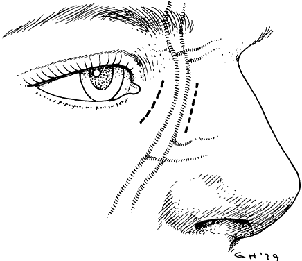 In monocanalicular lacerations, pigtail probe instrumentation poses a significant risk to the opposite canaliculus. This instrumentation system is recommended for experts only, or under closely supervised conditions.81 Identifying the proximal cut end of the canaliculus (or canaliculi) is perhaps the most trying experience in canalicular repair. If the laceration is distal and swelling is minimal, identification generally poses no problem because the canalicular diameter is fairly large (1 to 1.5 mm). If the laceration is close to or into the lacrimal sac and swelling is present, identification may be very difficult because the tissues are distorted and the membranous conduit is compressed. Allowing tissue swelling to subside with time, applying ice compresses, and injecting hyaluronidase solution with massage may restore normal contour and alignment so that the lacrimal laceration may be identified. If the opening cannot be identified, irrigation of the opposite canaliculus with air and flooding the field with water can demonstrate air bubbles emerging from the laceration site.82 Milky corticosteroid suspensions can also be irrigated through the opposite canaliculus and subsequently visualized at the laceration opening. Injection of methylene blue is not advised because it stains the tissues and may further obscure the anatomy. Canaliculitis Most cases of canaliculitis can be cured with vigorous curettage and topical antibiotic eye drops. The canaliculus is anesthetized with a local anesthetic infiltrated in the medial portion of the affected eyelid. The punctum is dilated if needed. Vigorous, repeated curettage of the canaliculus is performed with small and medium-sized chalazia curettes, which are advanced through the canaliculus up to the junction of the lacrimal sac. The repeated curettage maneuvers will withdraw yellow, granular “cementous” material that can be sent for culture and histopathologic examination. The dilated canaliculus often has multiple diverticula, thus the need for thorough curettage. Once the canaliculus has been cleared of all formed material, lavage with 1% tincture of iodine is performed, followed by treatment with antibiotic eye drops (e.g., sulfacetamide eye drops). Most cases of canaliculitis can be cured with this approach. Treatment failure is often due to incomplete curettage. Difficult, refractory cases of canaliculitis can be treated with complete surgical marsupialization (i.e., cut open the entire length of the posterior surface of the canaliculus and openly débride the canaliculus83). Lacrimal Duct Anlage The lacrimal anlage is typically located inferonasal to the medial canthal angle. Treatment is surgical excision of this congenital fistulous drainage tract of the lacrimal sac.84 During surgery, a Bowman's lacrimal probe may be placed within the lacrimal anlage to guide the surgeon. Sharp dissection is performed around the entire anomalous lacrimal fistula until the base is reached. The entire lacrimal anlage is then excised. Vicryl sutures (7-0) are used to close the excised base of the anlage. The remaining subcutaneous tissues and skin are meticulously closed in layers. In young children, with patients still under general anesthesia, it is very important to determine the patency of the lacrimal outflow system and nasolacrimal duct in its entirety. Irrigation or probing should be used to confirm its patency. If a distal nasolacrimal duct obstruction exists, intubation with silicone lacrimal tubes should be performed in young children. It is not necessary to perform DCR in the treatment of these patients. Canalicular Tumors Tumors of the canaliculi are rare and are best treated by complete surgical excision. Surgeons should consider full-thickness resection of the eyelid margin along with the affected portion of the canaliculus. Frozen-section monitoring of the margins should be performed during surgery to ensure complete excision of any lesion. Full-thickness canalicular defects can usually be closed by mobilizing the cut edges and internally splinting the reconstructed canaliculus with silicone lacrimal tubes. Common Canalicular Stenosis A localized stricture of the common internal punctum and segmental closure of the common canaliculus may follow repeated probing, may occur after DCR, and may follow inflammations such as herpes simplex and other inflammatory agents. If the problem is a very localized narrowing of the common internal punctum, silicone tube intubation can be attempted without the need for an open surgical procedure. It is a relatively favorable prognostic sign if the olive tip of a Crawford silicone tube can be passed through the localized stricture. Silicone lacrimal tubes are commonly left in position for at least 6 months. They act as an internal splint to dilate and maintain patency of the common internal punctum. In patients with common canalicular obstructions, it is important to determine whether an underlying nasolacrimal duct obstruction is present as well. Putterman has described a clever technique of transcutaneous dacryocystography.85 In this technique, a 25-gauge needle is used percutaneously to introduce water-soluble contrast dye directly into the lacrimal sac. A conventional roentgenogram is used to visualize the lacrimal sac and nasolacrimal duct for pathology. This diagnostic technique bypasses the problem of an occluded common canaliculus and allows the surgeon to determine whether concomitant DCR is necessary along with treatment of the common canalicular obstruction. If attempted probing of the canaliculi reveals that the segment of occlusion is quite wide, an open surgical procedure is necessary to attempt to reconstruct this region. A typical DCR skin incision is used to expose the lacrimal sac region. The lacrimal sac should be slit open carefully to expose the occluded common internal punctum. An 00 lacrimal probe is maintained in the involved canaliculus to help localize the lateral extent of the p