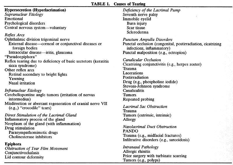A patient presenting to an ophthalmologist with tearing should be evaluated in a systematic manner, and the proper sequence should be observed to promote efficient use of time and to avoid confusion. HISTORY In evaluating a patient with tearing symptoms, no diagnostic technique is more valuable than taking a careful history. A unilateral watering eye is more commonly a sign of an obstructive process, although bilateral nasolacrimal duct obstructions can occur. Is there actual excess tearing in which tears run down the patient's cheek(s) and require frequent dabbing, or does the patient have diminished visual acuity and simply refer to the sensation as “my eye is tearing”—a common complaint of patients with macular degeneration. The primary consideration for clinicians is to distinguish epiphora from hyperlacrimation. Epiphora denotes symptoms of excess tearing due to lacrimal outflow deficiency. Hyperlacrimation denotes that an excess production of tears accounts for the patient's symptoms. Table 1 shows a classification scheme for tearing disorders, including the differential diagnosis of epiphora and hyperlacrimation. Patients with hyperlacrimation commonly have ocular discomfort. A chronic gritty foreign body sensation associated with excess tearing is typical of patients with keratitis sicca (“dry eye” syndrome). Patients with entropion or trichiasis, blepharitis, corneal abrasions, chronic conjunctivitis, or photophobia and iritis also frequently have hyperlacrimation symptoms. In addition to the comfort of their eyes, patients should be questioned about prior seventh nerve palsy or increased tearing while eating. Patients with epiphora commonly have “excess tears” as their only symptom. The examiner should carefully question the patient about intermittent redness of the eyes, mucous production or heavy lid crusting in the morning, pain or swelling in the region of the lacrimal sac, or prior episodes of acute dacryocystitis. These symptoms may indicate chronic or intermittent dacryocystitis. Severe, intermittent symptoms of tearing or dacryocystitis that are interrupted by completely normal periods may suggest a “ball valve” disorder such as dacryolithiasis. The clinician should question the patient with epiphora to focus on the key anatomic areas of interest. A history of facial nerve paresis, scleroderma, or lid scarring may indicate a dysfunctional lacrimal pump mechanism. The chronic use of phospholine iodide, idoxuridine, or prior severe conjunctivitis can point toward punctal stenosis as the problem. A history of previous lacrimal therapy may be significant. Repeated probing or instrumentation of the lacrimal canaliculi can result in severe canalicular stenosis. Prior “overaggressive” punctoplasties may actually impair tear elimination. Patients should be questioned about a history of chronic allergies or sinusitis, previous nasal or sinus surgery, and prior midfacial fractures or radiation therapy. Any of these would be pertinent in considering a possible nasolacrimal duct obstruction. The age of the patient (child, adult, elderly) and the duration of the symptoms (acute, chronic) are relevant. These variables have an important bearing on the likely cause of the problem and thus greatly influence the treatment that is implemented. Childhood lacrimal obstructions are usually due to an imperforate membrane at the distal nasolacrimal duct. Adults, once hyperlacrimation has been ruled out, commonly have the syndrome of PANDO. This type of adult lacrimal obstruction is potentially reversible if the blockage is functional or if symptoms have been of a relatively short duration (less than 6 months). Chronic epiphora symptoms (greater than 12 months) are rarely treatable with any method other than definitive DCR. Specific management of these epiphora problems is expanded on in the treatment section. EXTERNAL EXAMINATION The puncta should be examined with the use of the slit lamp. They should be positioned in the lacrimal lake and should not be visible without mild eversion of the lid. The eyelid movement, with each blink, is normally a nasalward compression in which the lids are completely in contact with the globe and move toward the inner canthal area. There should be no mechanical or contour obstruction of the margin impeding the movement of the tear film across the lower lid into the lacrimal lake. The punctal opening should be patent without stenosis or external occlusion. External diseases of the eyelids that may be irritating, or keratitis that may be producing a hypersecretion of tears, must be detected. The flow of fluorescein into the punctum can be observed. Swelling and redness of the punctum in the canaliculus may indicate canaliculitis. PRESSURE OVER LACRIMAL SAC A simple, quick confirmatory test for sac and nasolacrimal duct infection and probable obstruction, particularly when a patient has a history of dacryocystitis, is massaging of the tear sac. The sac may or may not be distended; however, regurgitation of mucus or pus through the canaliculus and puncta is indicative of dacryocystitis and obstruction, either intermittent or permanent, in the nasolacrimal duct or sac. IRRIGATION OF CANALICULUS Syringing saline into the lower punctum demonstrates complete or severe obstruction in the nasolacrimal duct or sac if saline regurgitates through the upper punctum. This regurgitated substance may be clear or accompanied by mucopurulent material and is diagnostic of obstruction in the nasolacrimal duct or sac. Saline that irrigates into the nose with syringing indicates only that there is not a complete obstruction in the membranous conduit of the lacrimal system. It does not rule out an incomplete block (partial block) or what has been termed a functional block, which may prevent tear passage into the nose under normal tear flow pressure. With irrigation of the lower canaliculus, if the saline neither goes into the nose nor regurgitates from the upper 