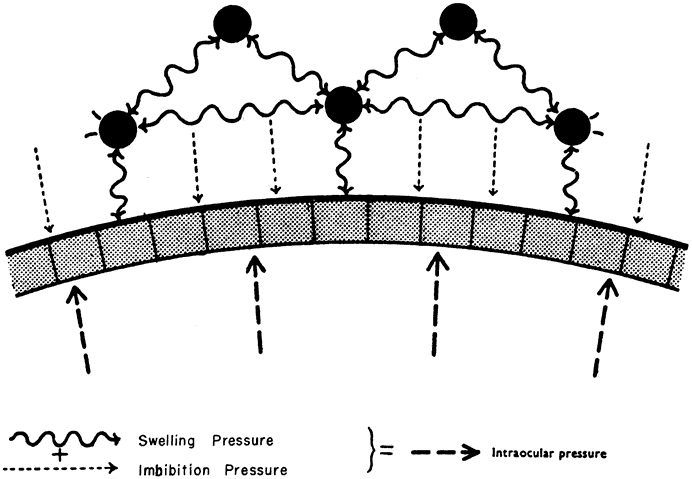 Evaporation From the Corneal Surface Evaporation was shown to play a major role in the thinning of rabbit cornea.17 However, only 4% of thinning occurs in humans as a result of osmotic extraction of fluid due to tears made hypertonic by evaporation.18 This loss of fluid is readily replaced by aqueous and therefore plays little role in corneal dehydration. Intraocular Pressure Elevated IOP can cause epithelial edema, but it is not associated with a change in corneal thickness. Ytteborg and Dohlman19,20 showed that when the IP becomes positive—that is, when the IOP exceeds the SP—epithelial edema ensues. Microcystic changes may occur in several settings. One case involves high IOP and normal stromal SP and thickness, as in glaucoma. The other setting occurs with a normal IOP and low stromal SP, such as that seen in the corneal edema of endothelial dystrophies. Stromal edema may follow microcystic epithelial changes. In summary, maintenance of normal corneal hydration is achieved by the barrier function of both the epithelium and endothelium, preventing excessive imbibition of water from the tears and aqueous. In addition, the active transport of some anions and cations contributes to the normal corneal thickness with obligatory transport of water out of the cornea via the endothelial pump. |