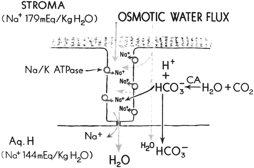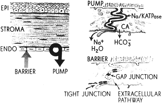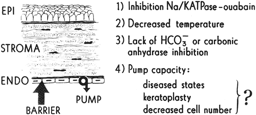 Endothelial Pump A constant amount of fluid leakage occurs across the endothelium from the anterior chamber, a finding that validates the fact that another mechanism aids in maintaining corneal deturgescence. The cornea has been observed to thicken in cooled enucleated eyes, whereas subsequent warming promotes thinning to the original thickness.12 This “temperature reversal” of hydration requires oxygen and does not occur in the presence of metabolic inhibitors, such as ouabain, which block cation transport.13,14 Deturgescence with warming suggests that there is an active transport of water and/or electrolytes from the stroma in order to maintain normal corneal hydration. Furthermore, after the epithelium has been removed, the temperature reversal effect still occurs, showing that the metabolic pumps exist within the endothelium.13 Evidence now points to ion transporter complexes within the endothelium that facilitate the passive secondary movement of water inflow. Although the active transport of sodium and potassium ions may play a role in the endothelial pump, the major component of the pump is the active transport of bicarbonate ions into the aqueous humor.15 A negative electrical potential exists on the aqueous side of the endothelium, suggesting the bicarbonate anion, rather than the sodium or potassium cation, is responsible for the fluid transport across the endothelium.16 The endothelial pump is dependent on oxygen, glucose, carbohydrate metabolism, and ATPase (Fig. 4). Dactinomycin, ouabain, and oligomycin are potent inhibitors of this system. Factors that influence the endothelial pump function are listed in Figure 5.