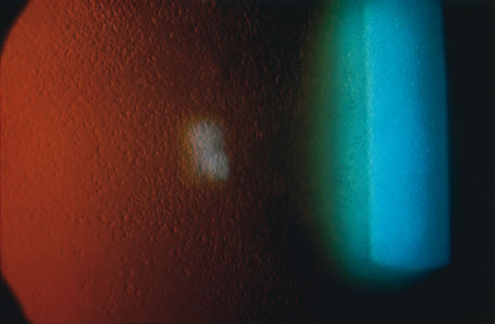 Additional irregularities may be found in the corneal stroma of Fuchs dystrophy. Edematous widening of the interfibrillar spaces alters the structure of the collagen lamella within the stroma and decreases its transparency. In the advanced stages of Fuchs' dystrophy, vascular connective tissue is found between the epithelial basement membrane and Bowman's layer, with fingers of fibrous tissue produced by fibroblasts that protrude upward into the epithelium, and may encapsulate islands of epithelium. The fibrous tissue formation causes other complications, such as epithelial erosions, microbial ulceration, and corneal vascularization. The thickened Descemet's membrane makes the beaten-metal appearance of the corneal endothelium seen centrally in the early stages of the disease. On specular microscopy, the endothelial cells are large and lose their hexagonal appearance. They become quite thin as the cell area increases to cover the posterior surface of the cornea with a diminishing number of cells. However, they constantly maintain a complete and intact covering over the posterior cornea. Fewer cells are present to maintain corneal deturgescence. The metabolic demands on the thinner cells become relatively increased in each cell, thus exacerbating the stress and causing corneal decompensation. Two-dimensional scanning fluorophotometry demonstrated no difference in the endothelial permeability between patients with mild corneal guttae, advanced corneal guttae, and normal age- and sex-matched controls.48,49 Moreover, an altered Na-K ATPase pump rate in the endothelium of patients with advanced guttae was found, suggesting that a decreased pump rate may be the earliest defect seen in Fuchs' dystrophy. Subsequent studies demonstrated that Na-K ATPase pump site density is decreased as well.50–53 These studies suggest that diminished pump function, rather than increased permeability, is the cause of corneal edema in Fuchs' endothelial dystrophy. TREATMENT. Initial treatment for the early stages of Fuchs' dystrophy consists of medical management to alleviate symptoms. Dehydration techniques, such as desiccation with topical hyperosmotic preparations and dehumidification of the environment, may provide temporary improvement in symptoms of mild cases. Ultimately, surgical management is warranted, with penetrating keratoplasty representing the treatment of choice when the disease progresses to increased corneal edema; decreased visual acuity; and painful, recurrent corneal erosions. Other surgical options may include various posterior keratoplasty techniques that involve replacement of endothelial cells, such as posterior lamellar keratoplasty. (Treatment options for corneal edema are discussed later in the chapter.) Posterior Polymorphous Dystrophy HISTORY. Posterior polymorphous dystrophy (PPMD) is an autosomal dominantly inherited, bilateral disorder that was initially described by Koeppe54 in 1916 and later characterized as a dystrophy by Theodore37 in 1939. The majority of cases are asymptomatic, with no reduction in visual acuity, but the expression of the disease is quite variable and some patients may develop stromal edema and secondary epithelial edema that causes severe and permanent impairment in visual acuity.55 CLINICAL MANIFESTATIONS. Posterior polymorphous dystrophy can be manifested as three patterns within the cornea. The most common corneal finding is a small asymptomatic, discrete, round gray vesicular lesion within an otherwise clear cornea on slit lamp biomicroscopy. Less common lesions include band lesions and small, diffuse gray endothelial opacities. The vesicular lesions appear in the posterior cornea at the level of Descemet's membrane and the endothelium. On high magnification, the lesions appear as an indentation or “pox mark” on the endothelium. Larger geographic lesions or a coalescence of grouped vesicles may be found in the same region of the cornea and result in corneal edema (Fig. 10). The posterior corneal findings correspond to abnormal deposits of collagenous tissue on the posterior surface of Descemet's membrane, which is irregular and thin in localized areas.30,56 Additional anterior segment findings may be present in conjunction with the corneal edema, and congenital corneal edema has been reported as well.55,57,58