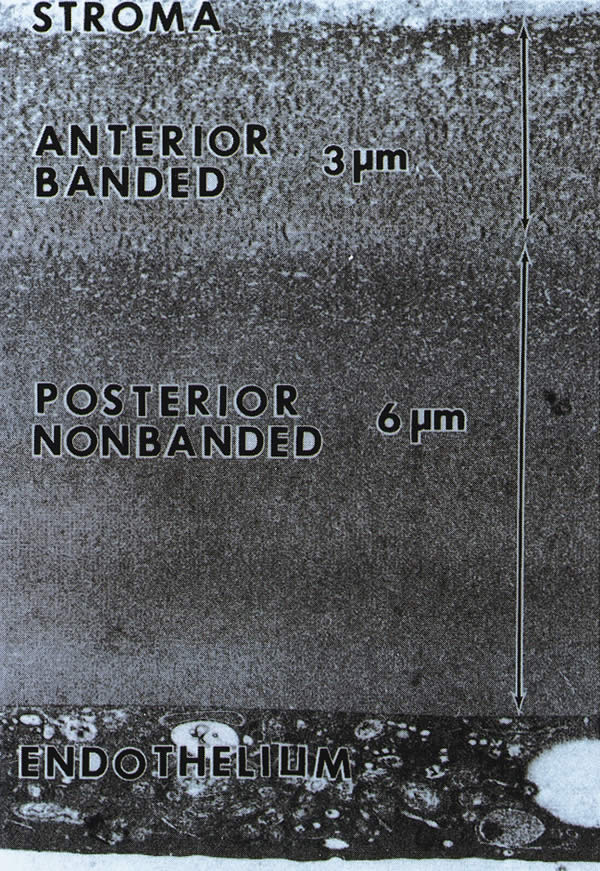 EPIDEMIOLOGY. Fuchs' corneal endothelial dystrophy occurs with a 3-to-1 ratio of women to men affected with symptoms. Expressivity of the disorder is more pronounced in female patients.6,32 Although the incidence of Fuchs' endothelial dystrophy has not been reported since Fuchs' original description, a number of studies have determined that 3% to 18% of all patients have asymptomatic corneal guttae.33–35 Lorenzetti and colleagues36 in 1967 studied 2002 eyes in 1016 patients, looking for a relation between guttae and Fuchs' dystrophy. They found that 31% of patients under age 40 had guttae, and 70% of patients over age 40 had corneal guttae. Of this70 %, only 3.8% had greater than stage 1 Fuchs' dystrophy and only 0.1% had epithelial edema or bullae. Although corneal guttae have been linked with familial inheritance patterns since 1939, recent studies have confirmed the autosomal dominant inheritance of corneal guttae and Fuchs' dystrophy.32,37–41 Krachmer and colleagues42 examined the relatives of 228 patients with corneal guttae and found 38% of patients' relatives over age 40 were affected. Studies by Magovern and associates40 and Rosenblum and colleagues41 concluded that Fuchs' dystrophy is indeed an autosomal dominant disorder with 100% penetrance and variable expressivity. HISTOPATHOLOGY. The underlying pathologic mechanism in Fuchs' endothelial dystrophy is dysfunctional and diseased endothelial cells. This dysfunctional state can increase the corneal thickness from the normal average of 520 μm to 1000 μm or more.43 Additional investigations suggest alternative abnormalities within the cornea may add to the effects of dysfunctional endothelium in causing Fuchs' dystrophy. Aberrant apoptotic regulatory molecules within stromal keratocytes may play a role in the pathogenesis of this disease, whereas other investigators have suggested abnormal mitochondrial DNA as a possible inciting agent in Fuchs' endothelial dystrophy.44,45 In the normal cornea of a middle-aged person, Descemet's membrane is 12 μm thick and consists of type IV collagen. Descemet's membrane is composed of an anterior banded portion, which is 3 μm thick, and a posterior nonbanded portion of variable thickness. The thickness of the nonbanded component averages 9 μm in adults, but increases from 3 μm at age 20 to 10 μm at age 80 as a result of continuous secretion by the endothelium throughout life. Clinically evident corneal guttae create thickening of Descemet's membrane, viewed in prepared specimens as focal densities from confluent excrescences or warts.46 In patients with Fuchs' dystrophy, posterior nonbanded portion of Descemet's membrane is attenuated or absent because the dysfunctional endothelial cells produce abnormal banded collagen instead of normal collagen. The posterior banded layer in Fuchs'dystrophy accounts for most of the increased thickness of Descemet's membrane (Fig. 9). Bourne and colleagues47 reported that a posterior nonbanded layer is normally found in the cornea of patients older than 20 years, so the presence of a posterior banded layer suggests abnormal endothelial function starting at an early age. Diseased endothelium can secrete 110-degree banded portions in focal areas of Descemet's membrane, and consequently a localized abnormality may account for the Hassall-Henle warts and/or corneal guttae. Additional disease may result in secretion of collagen that is so disrupted that it forms a nonbanded appearance. Different areas of Descemet's membrane can reflect different mixtures of nonbanded (normal) and banded (abnormal) portions of collagen secreted by the endothelium in different areas of the same cornea.