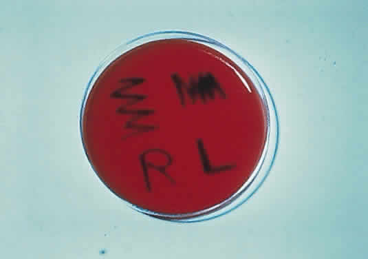 STAPHYLOCOCCI Staphylococci are among the most common bacteria encountered in ocular infections. Staphylococcus aureus (coagulase-positive staphylococcus) is generally considered to be a pathogenic organism. The coagulase-negative staphylococci include Staphylococcus epidermidis, which is thought to be part of the normal body flora. There are at least 14 other species of coagulase-negative staphylococci that are rarely associated with infectious keratitis.31 During microscopic examination, staphylococci almost always appear Gram-positive, are spherical with a mean diameter of approximately 1 mm, and are seen extracellularly. Old cultures or scrapings from antibiotic-treated cases may show Gramnegative staining characteristics. Although grape-like clusters are frequently seen in scrapings or smears from nonocular tissues, these are unusual in scrapings from corneal ulcers, in which single cocci or clusters of two to six cocci are observed. Two species, S. epidermidis and S. aureus, cannot be distinguished by Gram stain; however they show distinct characteristics in culture. In general the staphylococci are easily cultured on standard bacteriologic media (see laboratory section) and grow rapidly in incubation at 37°C. They do not have a distinctive odor and grow in the presence or absence of oxygen. Typical colonies are round, flat, smooth, and several millimeters in diameter by 48 hours (Fig. 1). S. aureus colonies show beta hemolysis (clear zones of hemolysis on blood agar) and some degree of pigmentation (light cream to golden yellow). In contrast, S. epidermidis colonies are usually nonhemolytic and rarely exhibit pigmentation.