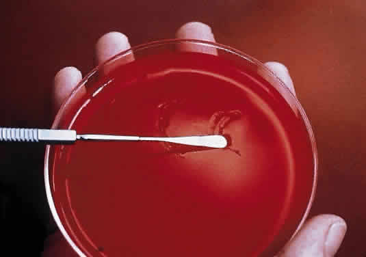and rational antimicrobial therapy. The initial procedure should be obtaining culture material from the conjunctivae and lid margins of both eyes. The use of anesthesia in this procedure should be avoided because preservatives in most topical anesthetics may cause a decreased yield of live organisms. Calcium alginate swabs are made of inert material (alginic acid) and are preferred to cotton swabs, which frequently contain fatty acids that inhibit bacterial growth.89,90 The swab should be moistened in a liquid medium (brain-heart infusion or thioglycolate broth) and the entire lower cul-de-sac should be wiped. The upper and lower tarsal conjunctivae and all of the material obtained is placed directly into culture. All conjunctival specimens should be plated directly onto blood agar, chocolate agar, Sabouraud's dextrose plates, and thioglycolate broth. The upper and lower lid margins also should be cultured and placed on the same plates used for the conjunctival specimens (Fig. 13). Next, the cornea in the affected eye is anesthetized using proparacaine hydrochloride (0.5%) because it is the least bacteriocidal of the topical anesthetic agents. Corneal specimens are taken under biomicroscopic guidance. A flame-sterilized platinum spatula (Kimura or Lidner) or calcium alginate swab may be used. Calcium alginate swabs moistened in a nutrient broth may yield a higher number of positive bacterial cultures compared with the platinum (Kimura) spatula technique.91 If the surface of the ulcer has mucus or necrotic debris on it, this must be removed (and cultured) before material that is more likely to contain live organisms can be obtained. Some organisms (e.g., Streptococcus pneumoniae) are more often found at the leading edge of an active ulcer; others (e.g., Moraxella) are more frequently found deep in the base of the ulcer. Therefore it is imperative to obtain material from both areas to optimize the yield. An ulcer may require multiple scrapings before live organisms are obtained. Each corneal scraping may be inoculated onto the surface of the media in a row of C streaks (Fig. 14). Each additional scraping should be plated as a new row of streaks. Penetration of the surface of the agar should be avoided because this can result in deep deposition of organisms, which hinders isolation. It is essential when culturing a corneal ulcer not to touch the lids or conjunctiva with the sterile spatula.