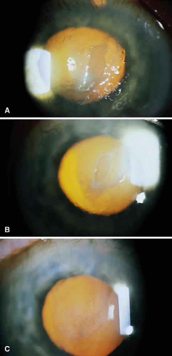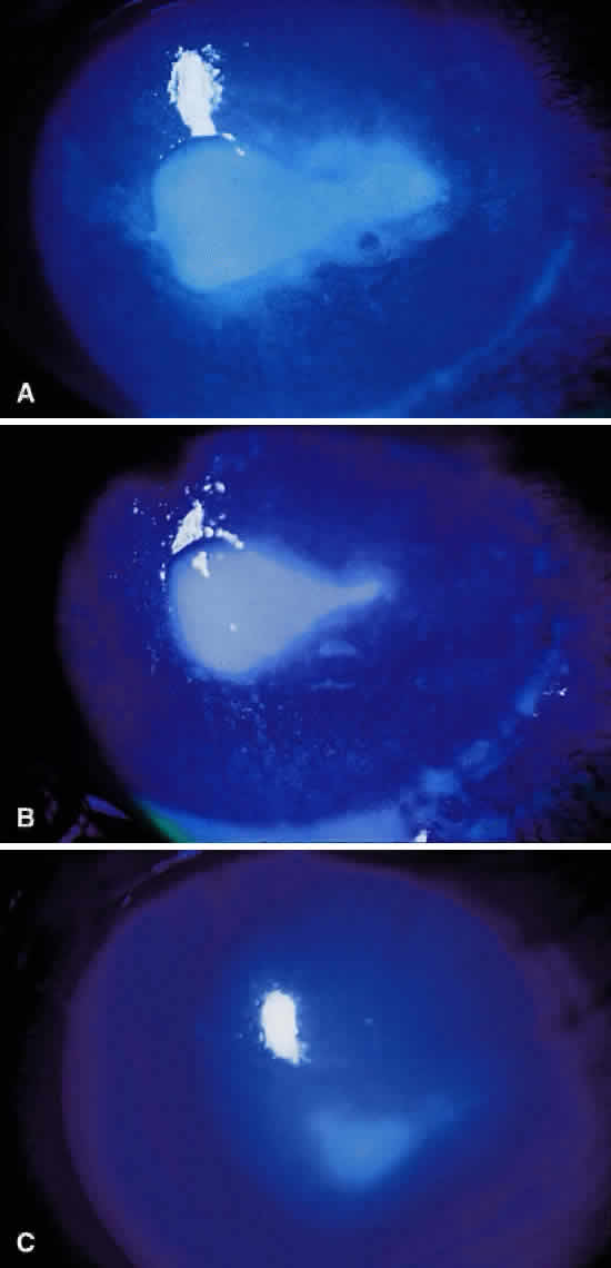 If no organisms are seen on the initial Gram stain smear, a decision must be made as to whether or not the ulcer is infectious. If the ulcer is judged to be noninfectious, treatment may be deferred for 12 to 24 hours, with re-examination at that time. It is important that the clinician be familiar with the signs of an active corneal infection so that treatment is not unduly delayed. When in doubt, it is safest to initiate broad spectrum treatment in an attempt to control the infectious process at an early stage, rather than waiting for culture results or clinical progression. Once antibiotic treatment has been instituted, management of the microbial keratitis is based on the careful modification of therapy and the judicious use of adjunctive measures to promote rapid healing. The decision to modify therapy is based on several factors, including clinical response to initial therapy, preliminary culture results, and tolerance of the antimicrobial agents. The clinician must examine the patient on a daily basis after the initiation of antibiotic therapy and compare subsequent findings with the original appearance of the ulcer. As stated earlier, it is essential in the work-up of the patient to document with a clinical drawing or photograph the extent of involvement and the main characteristics of the infectious process (see Fig. 10). The corneal ulcer at 18 to 24 hours may begin to show subtle signs of improvement if appropriate antibiotic therapy has been instituted. Specifically, evidence of a decreasing epithelial defect (Fig. 19); reduction in the size, density, and edges of the stromal infiltrate (Fig. 20); and a decrease in the surrounding white blood cell reaction (Fig. 21), as well as the anterior chamber reaction, indicate clinical improvement of the corneal infection (Table 6). Recognition of these clinical signs is crucial when beginning the modification of therapy and should be used to reach a therapeutic decision in combination with the preliminary culture results. The clinician should check with the laboratory within 18 hours of obtaining the cultures because tentative bacterial identification is often possible at that time. It is important to note, however, that the initial antibiotics employed should be continued for at least 36 to 48 hours if clinical improvement is observed, despite preliminary results from the laboratory. If, on the other hand, there has been deterioration despite 24 to 48 hours of antibiotic therapy, therapeutic changes should be made based on culture results. In some cases the stromal infiltrate may improve but the epithelium and conjunctiva worsen because of the toxicity of the fortified topical antibiotics. Thus, a patient may have an improved stromal infiltrate in the setting of an enlarged epithelial defect and increased conjunctival chemosis after 24 hours of fortified topical antibiotics.98 This problem may be remedied by reducing the frequency and concentration of the applied antibiotics. The clinician should be aware that many of the concentrated topical antibiotics are potentially toxic to the ocular surface, and a worsening of this aspect of the clinical picture may not reflect a true progression of the microbial keratitis.