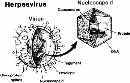 MORPHOLOGY Herpes simplex virus (HSV) is a member of the Herpesviridae family. The virion is 180 nm in diameter. It is composed of four principal components: the core, the capsid, the tegument, and the envelope (Fig. 1). Core The viral core contains double-stranded DNA used for viral replication. The viral genome has a molecular weight of 100 × 10,1,2 large enough to encode approximately 70 proteins and 72 genes.3 The viral DNA molecule is arranged as a double helix composed of two chains of repeating units of deoxyribose and phosphate, with purine and pyrimidine bases extending sideways from the sugar. The purine bases are guanine and adenine, whereas the pyrimidine are cytosine and thymine. The chains are linked together by the pairing of protruding bases to form the double helix. All the information required for virus replication is inscribed on the DNA molecule in a code constructed according to the order of repetition of the four bases. The physical form of the DNA of the virion in the replicating and latent virus is different. In the virion form of the virus, the DNA is linear but after infecting a cell it becomes circular. The viral DNA contains several classes of genes that encode regulatory proteins, structural proteins, and enzymes that are spread in a highly regulated fashion during the replicative cycle.4 Latency-associated transcripts (LATs) represent limited transcription of viral DNA during latency and serve as a marker for latently infected cells.3 Capsid The viral DNA is enclosed within a protein shell with an icosahedral shape called a capsid. The capsid is composed of 162 five- or six-sided subunits called capsomeres.3 In addition to protecting the viral genome, the capsid allows entry of the viral DNA into the host cell. Tegument A region of amorphous protein called the tegument lies between the capsid and the outer envelope. Tegument proteins, in association with cellular factors, play a role in inducing transcription of viral proteins5 and modulate host protein production.3 Outer Envelope An essential component of the infective particle is the outer envelope. The envelope is composed of lipoproteins, carbohydrates, and lipids that have been derived from the host cell and have been modified by the viral protein.3,4 Embedded within the envelope and projecting from the external surface are glycoprotein subunits called peptomers, which play a role in viral attachment and penetration into the host cell.2,3 PATHOGENICITY The virus shows a tropism for human tissues of ectodermal origin. In addition to the ocular infection and the well-known skin and mucous membrane lesions, herpes is responsible for a meningoencephalitis and has been associated with trigeminal neuralgia. In disseminated infections, it may replicate in liver, adrenal, and lung parenchyma. REPLICATIVE CYCLE HSV is an obligate intracellular parasite. Although it contains the genetic material necessary to induce its own replication, it does not have the metabolic machinery necessary for biomolecular synthesis. It enters the host cell and uses the host cell metabolic pathways, often causing destruction of the host cell. The replicative cycle has three phases: entry, eclipse, and envelopment and release. Entry Phase The host cell and the virus come in contact and bind by means of specific cell surface glycosaminoglycans, principally heparan sulfate.2,6 Lytic genes are expressed, and the virus enters the cell fusion of the virion envelope with the cell's plasma membrane. It then penetrates the host cell cytoplasm in a pinocytotic vesicle, where the envelope is removed. Enzymatic digestion results in uncoating of the capsid. The bare viral capsid moves to the host cell nuclear pore, where it is disassembled and the viral DNA released. Eclipse Phase The eclipse phase of the replicative cycle is characterized by intense molecular activity within the host cell nucleus and loss of recognizable viral morphology. The viral DNA unwinds and is transcribed by messenger RNA, which in turn directs viral protein synthesis within the ribosome. Enzymes, structural proteins, and regulatory proteins are produced. Most of the proteins are returned to the nucleus. DNA replication and capsid reassembly occur there. Envelopment and Release Within 6 hours of entry, fully enveloped particles are detectable in the cells. The new viral particle is enclosed by the envelope, which is primarily derived from a nuclear membrane as it leaves the nucleus and enters the cytoplasm. The mature infected virus negotiates the cell membrane by a process of reverse phagocytosis to reach the extra cellular space. The cycle is now complete.7 SEROTYPES On the basis of site of isolation from the body and cell culture characteristics, two types of herpes simplex virus can be distinguished. HSV-1 characteristically produces oral, facial, and ocular lesions. It is responsible for 85% of ocular isolates. HSV-2 serotype has conventionally been associated with the sexually transmitted form of the disease. It is responsible for ocular disease in neonatal herpes simplex keratitis but in only minority of adult ocular infections. Simultaneous keratitis infection with both HSV-1 and HSV-2 has been described in a patient with acquired immune deficiency syndrome (AIDS).8 |