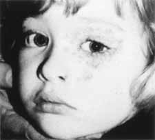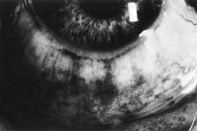 CLINICAL MANIFESTATIONS Primary ocular herpes is predominantly a disease of infants and young adults, but it can occur sporadically at all ages. Neonatal infection is caused by HSV-2 in approximately 80% of cases. The scant emphasis that primary herpetic infection has received in the literature is regrettable in view of its importance as a cause of follicular conjunctivitis or keratoconjunctivitis.11 These conditions remain largely unrecognized, therefore, affected patients may be exposed unwittingly to the hazards of corticosteroid administration. Although this section is principally concerned with the keratitis that often follows primary follicular conjunctivitis, it would be unrealistic to consider it as an entity distinct from the primary syndrome. Symptoms of infection appear 2 to 12 days after contact with an infected individual (although not necessarily one with an active lesion). In contrast to the recurrent form of the disease, there is mild malaise and fever, indicating a constitutional illness. Conjunctival injection, irritability and watery discharge are typically unilateral and rarely severe. The patient or parents, whose chief concern may be the skin lesions adjacent to the eye, may not even mention the ocular disease. The follicular conjunctivitis of primary herpes is associated with a regional adenitis. Typically, the ipsilateral preauricular lymph node is slightly enlarged and a little tender. Swollen lids and a primary skin lesion are often readily apparent (Figs. 3 and 4), but on occasion only a careful search will reveal the single or grouped vesicles of crusted ulcers (Figs. 5 and 6) hidden among the lashes or in the intermarginal strip. Similar lesions may be located elsewhere on the face or at the mucocutaneous junction of the mouth, in the nose, or on the trunk, and they may be easily missed unless a specific search is made. In nearly one fourth of cases, no cutaneous lesions are present.35 The conjunctiva is injected and edematous. Follicles develop, especially in the fornices, and extend to the tarsal areas (Fig. 7);they rarely occur at the limbus. Small subconjunctival ecchymoses are not uncommon and phylectenule-like lesions may develop on the globe (Fig. 8).