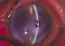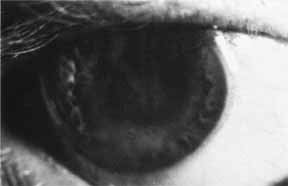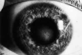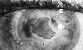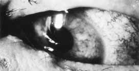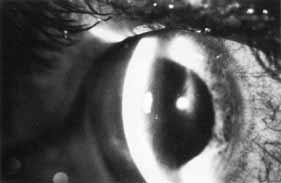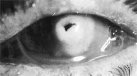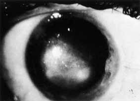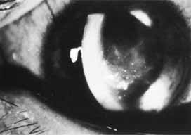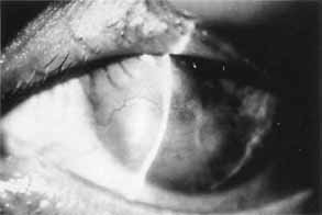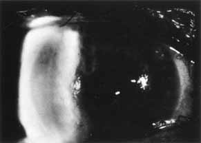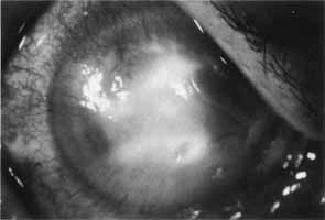 Anterior uveitis is invariably present although it may be difficult or impossible to assess because of the corneal opacification. In severity it varies from the presence of an occasional cell and minimal flare to the development of hypopyon. Posterior synechiae and rubeosis iridis frequently complicate severe cases. The intraocular pressure may be elevated in the acute stage as a result of an associated trabeculitis. Vascularization can occur at any stage of the disease process. Vessels penetrate the stroma from the limbus at all levels to invade the active stromal lesion. They are often cuffed by fine granular infiltrates while active but, as the inflammatory process subsides, they lose the cuff of cells and may eventually become almost bloodless. The first signs of a recrudescence of inflammation may be the reactivation of these vessels. During the acute stages of the inflammatory reaction, scarring may not be obvious, but as the signs of inflammation subside, it becomes more apparent. In the early stages the discrete white opacification may easily be mistaken for infiltrate. Once significant scarring has occurred, the clarity of the cornea is permanently impaired (see Fig. 20). Loss of corneal substance, ranging from minor faceting to gross thinning or even perforation, is of variable occurrence. It often relates to preceding dense infiltration and is most frequently seen in the rebound phenomenon following withdrawal of topical steroid therapy for stromal herpetic keratitis with dense infiltration (Fig. 26).
