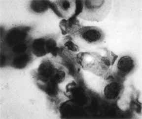 Within 2 weeks, approximately half of these patients develop corneal lesions associated with only relatively minor symptoms: a little grittiness, photophobia, and blurring of vision. Initially these lesions are epithelial and present a variety of appearances. A fine punctate epithelial keratitis, consisting of tiny white flecks in the superficial layers that stain poorly with fluorescein and variably with rose bengal, may be present. These are transient spots, only rarely progressing to larger lesions. As the flecks desquamate, fluorescein stains the flecks more intensively during the healing stages. A coarse punctate epithelial keratitis presenting a variety of shapes (circles, ovals, irregular elongated areas, and stellate figures) may appear. Any of these lesions may progress to macroscopic dendritic figures. They consist of slightly raised, closed clusters of opaque epithelial cells, those in the periphery often being the most regularly arranged. These swollen white cells stain well with rose bengal but poorly with fluorescein. Typical herpetic intranuclear inclusions can be demonstrated in these cells (Fig. 9).Initially, there is no stromal reaction, but within 2 to 3 weeks, and sooner if the lesions are peripheral (and regardless of epithelial healing), subepithelial infiltrates appear.35 DIAGNOSIS AND DIFFERENTIAL DIAGNOSIS The diagnosis can be made on clinical grounds alone in patients with typical cutaneous lid lesions or typical herpetic corneal lesions. In the absence of such lesions (approximately one fourth of all patients with primary herpetic conjunctivitis), laboratory investigations are essential for diagnosis. The differential diagnosis includes: