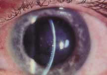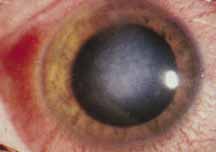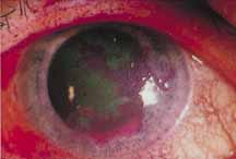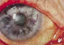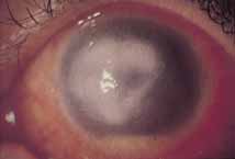 In mild cases, infiltrates can be localized, but in more severe cases a stromal abscess (Fig. 28) may develop, consisting of necrotic, cheesy-white infiltrate that may occupy the entire cornea thickness. The overlying epithelium often breaks down over the stromal infiltrate. This can be followed by the appearance of edema, ulceration, and stromal neovascularization. Ring infiltrates (Wessely ring) may occasionally be seen surrounding the stromal infiltrate (an antigen-antibody-complement–mediated event), calling forth an influx of polymorphonuclear leukocytes. Uveitis is nearly always present and may be severe, with retro corneal membrane, hypopyon, synechiae formation, secondary glaucoma and secondary cataract. Stromal perforation or super infection with fungi or bacteria can occur (see Fig. 26).