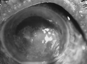 Keratitis caused by Nocardia, nontuberculous Mycobacterium, and other low-virulence bacteria resembles filamentous fungal keratitis by the presence of intact epithelium, multiple stromal infiltrates, and minimal inflammation in the adjacent stroma. Candida infection typically produces epithelial ulceration, focal necrotizing stromal inflammation, moderate cellular infiltrate and edema in the adjacent stroma, and mild or moderate iritis in the early stages, indistinguishable from bacterial keratitis (Figs. 15, 16, and 17). Fungal elements cannot be detected by biomicroscopy. If untreated, the keratitis evolves to produce dense suppuration and necrosis of the deep stroma. Although multifocal suppuration may develop in polymicrobial keratitis, there is no distinctive sign of mixed Candida and bacterial infection (Fig. 18).