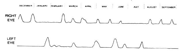 In contrast to simple episcleritis, the infiltration and edema of nodular episcleritis are localized to one part of the globe, forming a nodule and some surrounding congestion (Color Plate 1B). The nodule can be moved over the underlying sclera, which is not edematous. The scleral plexus of vessels can be distinguished deep to the nodule, lying flat on the sclera and slightly congested but otherwise normal in color and configuration (Figs. 15 and 16). Episcleral nodules may be single or multiple but do not undergo necrosis (see Fig. 16). After multiple attacks of nodular episcleritis in the same location, the superficial lamellae of the sclera show some alteration and become slightly more transparent in this one area. TREATMENT Even without therapy, simple episcleritis improves considerably within the first week and resolves within 3 weeks (Fig. 17). Provided the eye is not too uncomfortable, most patients can be persuaded to leave the eye untreated, because the condition will resolve spontaneously. However, if it is believed that some treatment is desirable, topical corticosteroids or locally applied nonsteroidal anti-inflammatory drugs (NSAIDs) may make the eye more comfortable and speed resolution slightly (see Fig. 17).9 Use of corticosteroid drops must be continued for several days after the inflammation has subsided to prevent the exacerbation of the condition that occurs if they are stopped suddenly. Prednisolone, betamethasone, or dexamethasone drops may be administered hourly until redness disappears, and then three times daily for 4 to 5 days. Under no circumstances should topical steroids be administered continually for more than a few weeks at a time because of the very real danger of inducing steroid glaucoma and cataract. If the condition fails to respond immediately, other treatment regimens should be sought. Ocular NSAIDs can be administered four times daily until redness disappears. Glaucoma and cataract have not been observed after prolonged use, but many patients become intolerant to the use of the ointment or complain of stinging and irritation. Whereas simple episcleritis resolves rapidly without therapy, the resolution of nodular episcleritis is much slower. Local therapy is consequently of much more value; the same regimen of treatment is followed. In the few patients in whom episcleritis becomes indolent, or in whom recurrences are so numerous that the patient becomes incapacitated, it is reasonable to consider systemic therapy with NSAIDs such as flurbiprofen (Froben), 100 mg three times daily, which usually gives immediate and prolonged relief of symptoms and signs. It is important to note that not all of the NSAIDs work in this condition. Treatment may be terminated abruptly when the condition comes under control. The complications of episcleritis are minor and are not responsible for any decrease in visual acuity. COURSE AND PROGNOSIS Whether treated or not, simple episcleritis will resolve in 10 to 21 days. It will usually reappear at irregular intervals and then eventually disappear. An accurate 12-month record kept by a patient who went without treatment is shown in Figure 18. He was free from any further attacks for 3 years. He then had four attacks in the next 3 months and has had none since. No etiologic or precipitating factor has been found. In nodular episcleritis, the nodule initially increases rapidly in size, sometimes reaching the size of a split pea. Thereafter it gradually regresses over a variable period and eventually disappears, although this may take up to 2 months without treatment. Recurrences occur also in nodular episcleritis, but the two varieties are not mutually exclusive (a simple episcleritis may recur as a nodular episcleritis and vice versa). However, episcleritis never develops into scleritis in the same attack, although it invariably accompanies scleritis. Of 180 patients initially diagnosed as having episcleritis, only 4 developed scleral involvement.10 Episcleritis is an entirely benign condition, although it may be a great nuisance to the patient. It may recur over a period of many years, but it rarely leaves any residual ocular changes except for some areas of scleral transparency or localized stromal keratitis in those patients who have had severe attacks of nodular disease occurring always at the same site. Of 180 patients analyzed,10 only 2% had a decrease in visual acuity of two lines or more within a year of the onset, and in every case this was from increasing involutional cataract. |