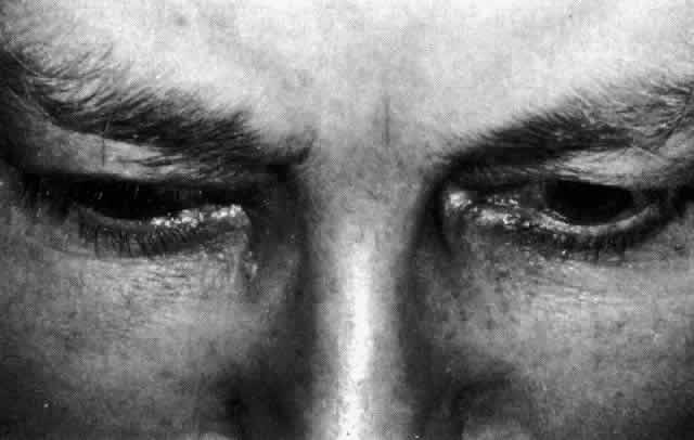 CLINICAL MANIFESTATIONS Lacrimation and photophobia are more common in scleritis than in episcleritis. However, they are not always clearly related to the severity of the scleritis or to the keratitis and uveitis that may accompany it. The pain of scleritis is its most dominant feature and is the symptom that causes the patient to seek medical advice. The exception to this is scleromalacia perforans occurring in long-standing rheumatoid arthritis, which may be entirely pain free. Pain, when it occurs, may be localized to the eye, but in 66% of patients it is much more diffuse, radiating to the temple, the jaw, and the sinuses. It is boring in nature, severe enough to prevent sleep, accompanied by malaise, and only temporarily relieved by analgesics (Fig. 26). The pain is particularly severe in those patients suffering from progressive necrotizing scleritis with overlying inflammation; eyes have been removed for this reason alone. The pain can be a diagnostic problem, particularly in the early stages of posterior scleritis before the vision becomes affected. Patients with posterior scleritis are often referred to neurologists and others because of the severity of the headache or ophthalmoplegia. The pain is probably caused by distention of sensory nerve endings as a result of edema. In the necrotizing disease, the severity of the pain is increased by the destruction of the nerve endings that takes place.