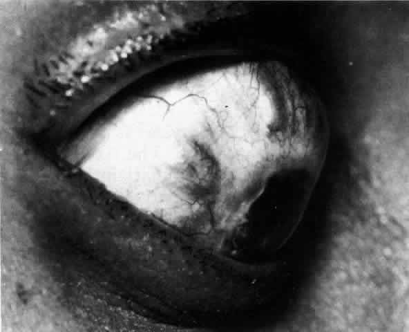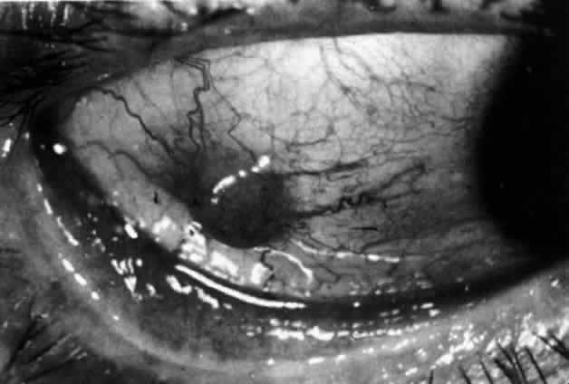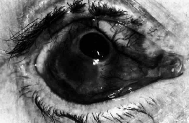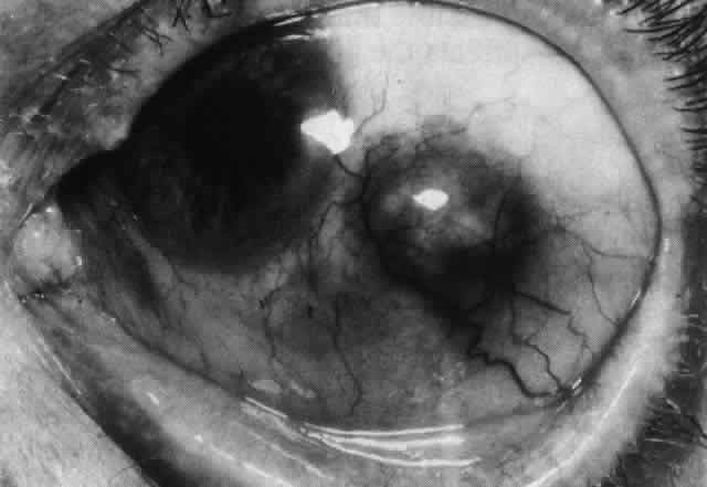 a tumor is suspected. The sclera forms a barrier for the spread of intraocular tumors, but the vascular and nervous intrascleral canals form a channel through which tumor cells can extend into the episcleral tissues. In certain instances, particularly in intraocular malignant melanomas, myelomas, and sarcoidosis, a vascular response is excited in the deep episcleral tissues with dilatation, tortuosity, and newly formed vessels (see Fig. 77). Deposits in episcleral tissue and tumors that arise from episclera often cause difficulty in diagnosis. The localized epithelial tumors, such as the intraepithelial epithelioma (Bowen's disease), present little difficulty because the deep tissues are rarely involved and the tumor ulcerates onto the surface (Fig. 84). The pigmented tumors also do not cause any great difficulty in diagnosis, but occasionally a nonpigmented nevus of the episclera of conjunctiva occurs. In the initial stages, these form a diffuse infiltrated lesion of the episclera usually very close to the limbus. As time passes, new vessels pass to the lesion, which may remain the same size or grow slowly (Fig. 85). Should malignant change occur within the lesion, the surrounding tissues will become inflamed and the feeding vessels greatly enlarged (Fig. 86). In necrotizing nodular scleritis, the large vessels adjacent to the inflammation enlarge but do not pass into the lesion itself, so the engorged vessels appear to skirt the nodule (see Figs. 27 and 28).