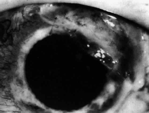 ACUTE STROMAL KERATITIS The corneal signs may arise simultaneously with the scleritis or occur later in the disease. An acute keratitis will often produce a limbal flush, which has occasionally been confused with a scleral inflammation. In lupus erythematosus, the corneal lesions may appear first, to be followed within 2 to 3 days by a diffuse scleritis. In the acute stage of the disease, the vision rapidly deteriorates because of a diffuse clouding of the cornea. Superficial and midstromal opacities appear both centrally and around the limbus (Fig. 68). If treatment is not instituted at this stage, vascularization will follow and the opacities will become permanent. However, if treatment is successful, the edema and the opacities can disappear completely. In nodular scleritis, the corneal changes are localized to the area of the inflammation, and should the condition recur, the opacity returns in exactly the same area, often extending farther into the cornea (Color Plate 1F). SCLEROSING KERATITIS Sclerosing keratitis is the most common corneal complication of scleral disease. Depending on the type of scleritis, the corneal changes may be diffuse, annular, or localized. The first change is a diffuse striate appearance affecting the full depth of the cornea that becomes slightly thickened and appears gray. These changes move toward the center of the cornea with surprising speed unless the condition is vigorously treated. Behind the advancing edge, spotty white opacities may develop in the cornea that may become “crystalline” in appearance, looking much like floss candy (Fig. 69). Occasionally, “precipitin rings” may appear around the white corneal opacities. Vascularization, when it occurs, appears to be entirely passive. The vessels show no active budding and follow a long way behind the advancing edge. The vascularization is usually superficial but can occur at any level. The cornea may become quite white and look like porcelain, but there remains a comparatively clear zone near the limbus. In recurrent nodular scleritis, the changes remain localized to one area. The change in the corneal stroma results in defective nutrition, so that, if the condition persists, lipid becomes deposited adjacent to the outer edge of the lesion, leaving a yellow opacity in the midstroma (Fig. 70). LIMBAL GUTTERING Limbal guttering may follow active scleral disease but is not characteristic of scleritis, and when guttering occurs without scleral inflammation in long-standing rheumatoid arthritis, the cornea looks as if it is covered by a corneal contact lens; the center is much thicker than the periphery. When limbal guttering follows a scleritis, lipid deposition is the rule. Occasionally, a Terrien-like ulcer can appear at the site of a prolonged scleritis, or the deep corneal layers may break, causing aqueous leakage into or through the cornea (see Figs. 65 and 66). When there is a severe vascular shutdown at the limbus or a severe necrotizing disease of this region, peripheral ulcerative lesions very similar to those seen in Mooren's ulceration may develop. These ulcers are infiltrated and swollen on the central margin, and there is also a marked infiltration at the advancing edge of the peripheral ulcer. The ulcer may be sloping or undermined. The epithelium almost always remains intact, and the base may be vascularized. The limbal arcades adjacent to the advancing edge are disrupted, and the new vessels that arise from the limbal arcades leak into corneal tissue. KERATOLYSIS Keratolysis occurs in very severe necrotizing disease or scleromalacia perforans in which the superficial layers of the previously clear cornea melt away, sometimes over areas of several millimeters (Figs. 71 through 74). In very severe cases, descemetoceles form, and although spontaneous rupture is unusual, the cornea is so thin that it can easily be ruptured by minor trauma, in which case the eye may well be lost (see Fig. 73). Treatment is urgent. If medical treatment can be instituted at once, the process will stop and some repair of the cornea will result (see Fig. 74). However, once descemetocele formation has occurred, surgery is the only treatment. Lamellar keratoplasty retains the integrity of the host endothelium and is effective for removing the necrotic tissue. Although multiple grafts may be required, this procedure is the most effective method of controlling the condition. Graft sutures will not hold unless the accompanying scleritis is adequately controlled; therefore, systemic therapy should not be discontinued at the time of surgery.
