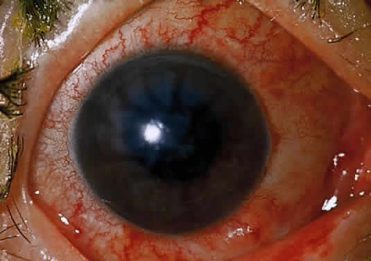 Fig. 2. Acute alkali burn of moderate degree. Scattered blanching of perilimbal vessels can be seen. Corneal epithelium is denuded. Mottled corneal edema partly obscures anterior chamber details.