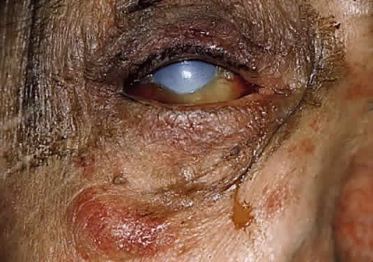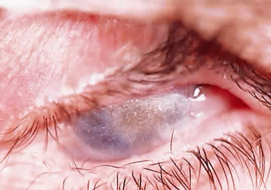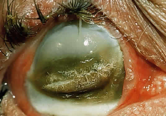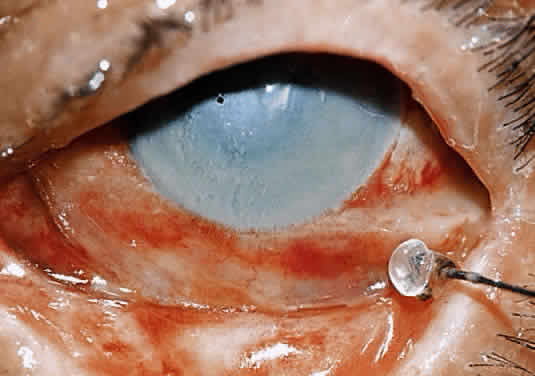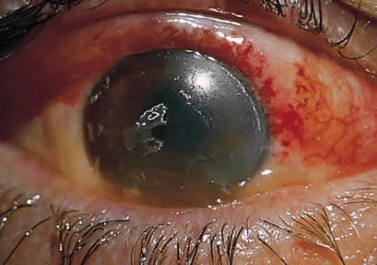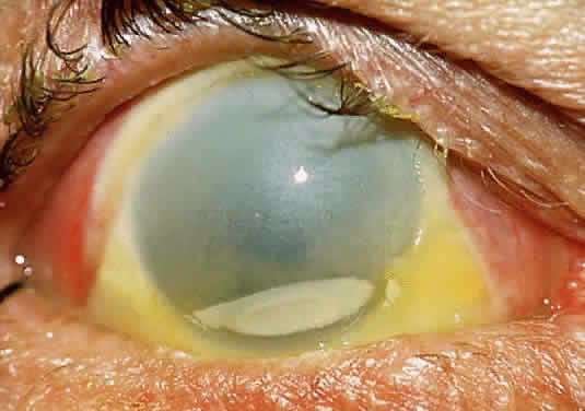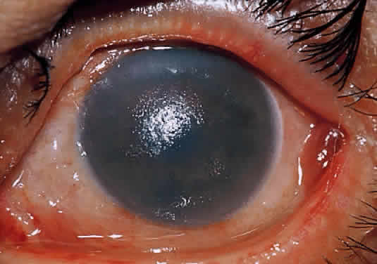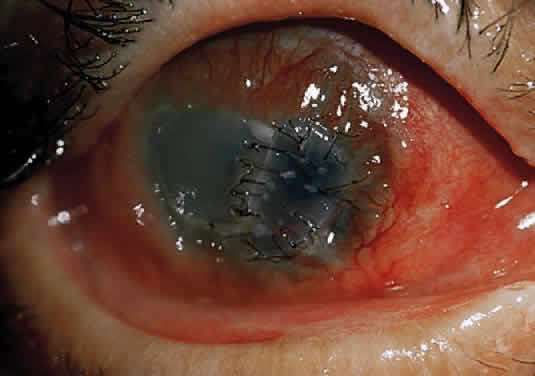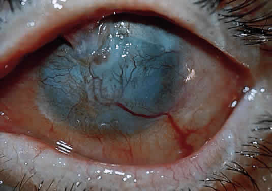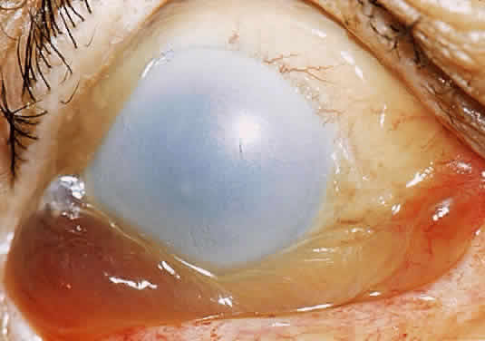 Fig. 6. Acute alkali burn of severe degree. The eye rolled upward in avoidance (Bell phenomenon), exposing the lowest aspect of the cornea to the greatest damage.