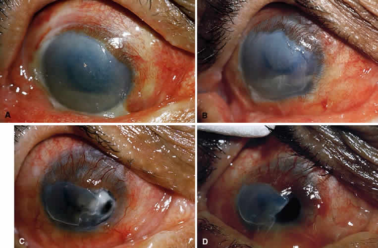 Fig. 7. Severe alkali burn. A. Two weeks after injury: pannus begins to invade the opaque cornea from above. B. Three weeks after injury: pannus grows as the cornea begins to thin and clear. C. Seven weeks after injury: collagenolytic erosion and descemetocele in advance of the pannus. D. Eight weeks after injury: frank perforation of the cornea.